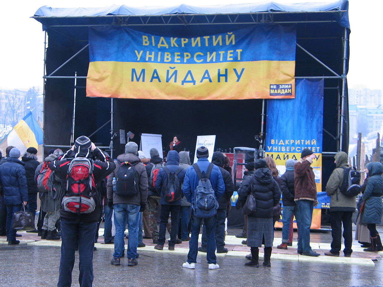 Speaking of the stage, if you visit Maidan as a “curious passerby” or “just another protester” the stage can leave quite a gloomy impression. From the loudspeakers you hear a kind of a strange populist hotchpotch: archaic slogans and outdated appeals, pretentious statements and corny poetry, rough nationalist rhetoric and psychotherapeutic prayers. These “speaking corners” are surrounded by little crowds of people who seem quite satisfied with what they hear. However, after a while you realize that, fortunately, all these hollow speeches are just one of the many facets of Maidan. Moreover, it is by and large far from the most representative of its facets. If you imagine Maidan as a living body, the cries from the stages are merely a vapor in the frosty air. The general rhetoric of Maidan is different. The stage is only a background for real work and real talk. The main discourses and narratives of Maidan are produced in the immediate process of communication between people without the aid of microphones or loudspeakers.