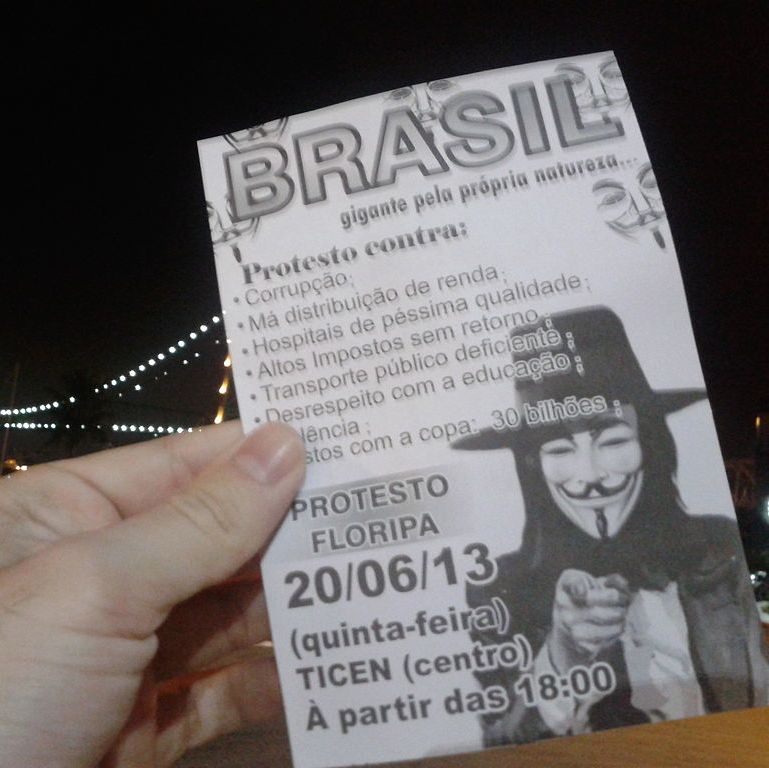 Now that 2013 is over, it seems safe to say that the major event last year in Brazil was the series of demonstrations that took place all over the country in June. What triggered the protests was a small rise in the cost of public transportation. On June 1st, fares increased R$0,20 in São Paulo city. On June 13th, a group of university students was severely beaten by the military police on Avenida Paulista. Many journalists witnessed the beating. Most protesters were injured, and two journalists almost lost their eyes. The beating was broadcast on national television and across social networks. Brazilians were appalled with police brutality in São Paulo, and thenceforth demonstrations spread throughout the nation.