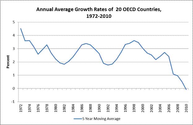 How are the various proximate causes of the fiscal crisis of rich democracies related? The common ultimate cause, I suggest, behind the proximate causes effective along the trajectory of the public debt build-up was the declining growth performance of the OECD world (Figure 11). After 1974, average real growth per year in OECD countries over five year periods fluctuated between two and three percent, apart from two peaks at the end of the 1980s and the 1990s when it rose to between three and four percent, albeit only for a short time. Thereafter, in the one-and-a-half decades since 1998, i.e., ten years before the Great Recession, average growth rates declined almost steadily until they bottomed out at zero in 2010. In addition, with the end of inflation in the 1980s the automatic devaluation of public debt ended as well. Moreover, low growth during the same period resulted in average unemployment rates between six and seven percent. After 1998 it also kept debt ratios high although budget deficits almost disappeared in 2002-2008 due to consolidation efforts. They were, of course, to come back with a vengeance as a result of the financial crisis.