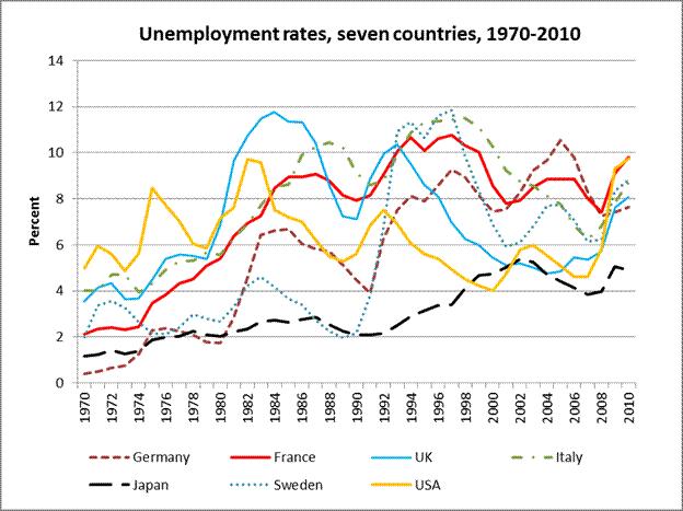 [7] The average rate of unemployment in the OECD was 2.2 percent from 1960 to 1973, from where it increased steadily to 7.1 percent in 1990 to 2001. From 2002 to 2008 it was at 5.8 percent, only to rise to 6.6 percent between 2009 and 2012.