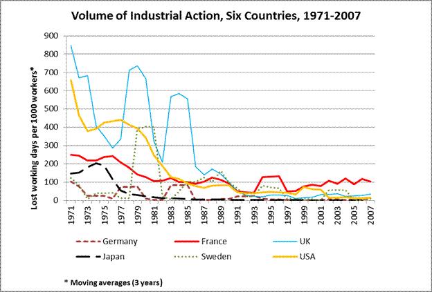 As to democratic power resources, participation in national elections in the OECD world peaked in the 1960s when it was as high as 84 percent on average for 22 countries (Figure 2). From there it dropped continuously from decade to decade and reached 73 percent in the eleven years from 2000 to 2011 (Schäfer and Streeck 2013). Unionization attained its highest postwar level in the 1970s and then began to fall everywhere (for six major countries, see Figure 3).[6] A third form of mass political participation, “industrial action”, also known as strikes, practically ended in the 1980s (see Figure 4, which omits Italy where strikes were extremely frequent in the 1970s but ceased almost entirely in the 1980s).