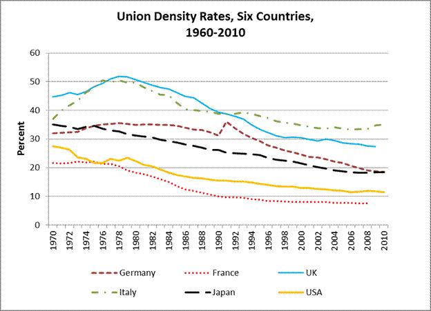 [6] Figure 3 does not include Sweden where union density was traditionally the highest in the world. Including it would have distorted the scale. Apart from this, the Swedish trajectory was very much in line with the other countries, except that the decline started later. At the beginning of the 1990s, union density in Sweden was still above 80 percent; by 2011, in about two decades, it had fallen to 68 percent.