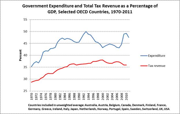 2. The end of both growth and inflation led to a sharp increase in tax resistance, first in the United States and then elsewhere in the OECD world. In response, several countries passed tax reforms to eliminate what is called “bracket creep”: the movement of tax payers into higher income tax rates with rising nominal incomes. In subsequent years, “globalization” and the resulting international tax competition (Genschel and Schwarz 2013) motivated tax cuts for high income earners and corporations.[9] Emblematic for this was the tax reform during Ronald Reagan’s first period of office (1981-1985), which together with deflation and an unprecedented arms build-up was instrumental in causing the most dramatic rise in government debt since the Second World War (Greider 1981; Stockman 1986). While tax revenue had until the mid-1970s by and large kept pace with public spending, by the late 1980s it began to stagnate until it started declining after the end of the century (Figures 8 and 9). By 2010, taxation levels were back where they had been two decades earlier.