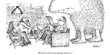 The Sandor Ferenczi Center at the New School recently had the pleasure of having longtime New Yorker cartoonist Edward Koren discuss his craft as part of its Arts in Mind series. The title of the event, “We deal with it by talking about it,” was derived from a well known New Yorker cartoon of Koren’s.