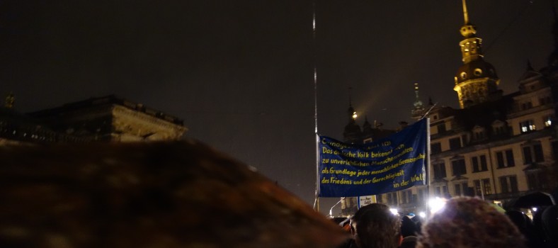 There is something exhilarating and powerful about walking through the dark, empty streets of Dresden’s old town chanting this slogan. A solitary message of support in a continent that is in a race to rebuild the old borders and impose new mobility restrictions with as much fanfare as it sought to dismantle them only twenty-five years earlier. Yet the message is also unnerving…
