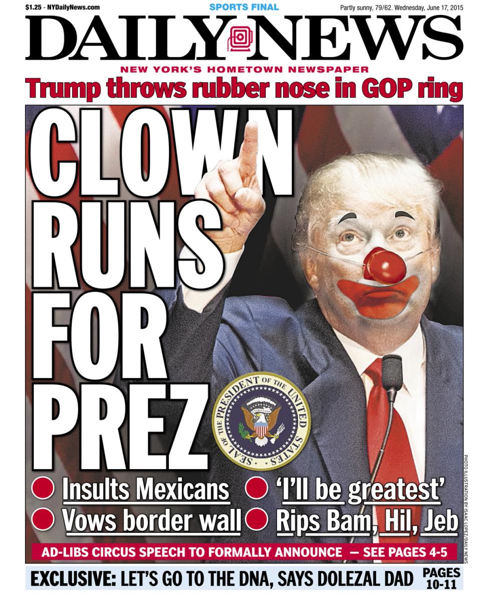 Much has also been said of Trump’s “reality show” brand of political engagement. For months leading up to the primaries, Trump was dismissed as a viable presidential contender due to his inexperience, his lack of substance, and media retorts that are more reminiscent of a Kardashian than a serious contender to the presidency of the United States. The Daily News has been especially strident in its critique of Trump as a potential entertainer-in-chief with multiple covers that depict Trump as a bumbling clown. In an interview with Bret Baier on Fox News, Trump’s rival Marco Rubio adopted the analogy, laughing off a Trump attack by referring to the presumptive Republican candidate as a clown and a “basket case”.