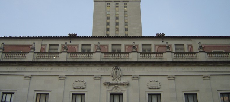 The most striking architectural feature of the University of Texas at Austin is the tower that sits atop a hill at the center of campus. It is a twenty-seven story limestone monolith; a “toothpick” according to one detractor, more suited to the New Jersey cityscapes that inspired its architect, than to the landscaped grounds and rows of squat Italianate villas that radiate out from it. The tower is, in many respects, the focal point of university life…