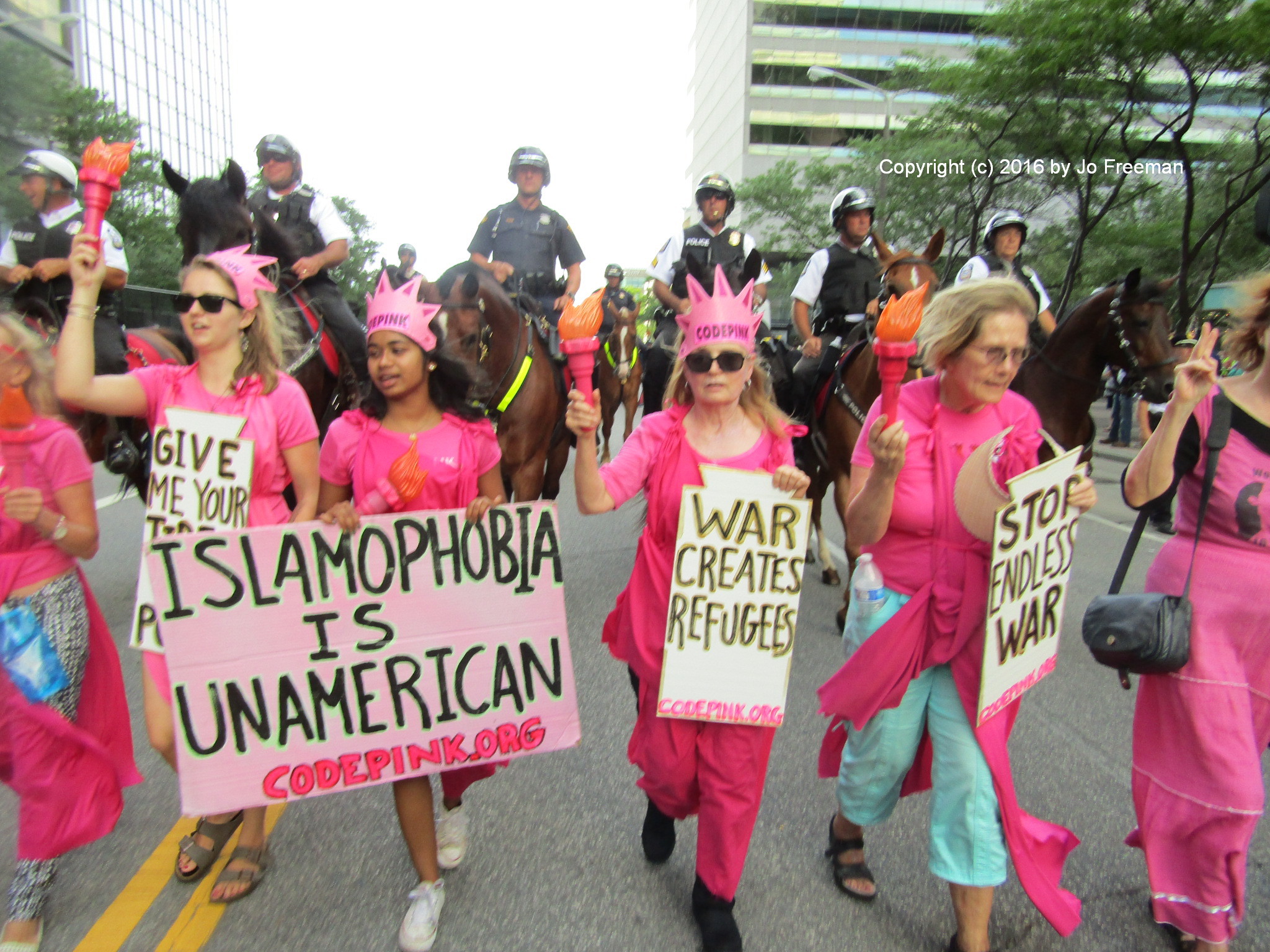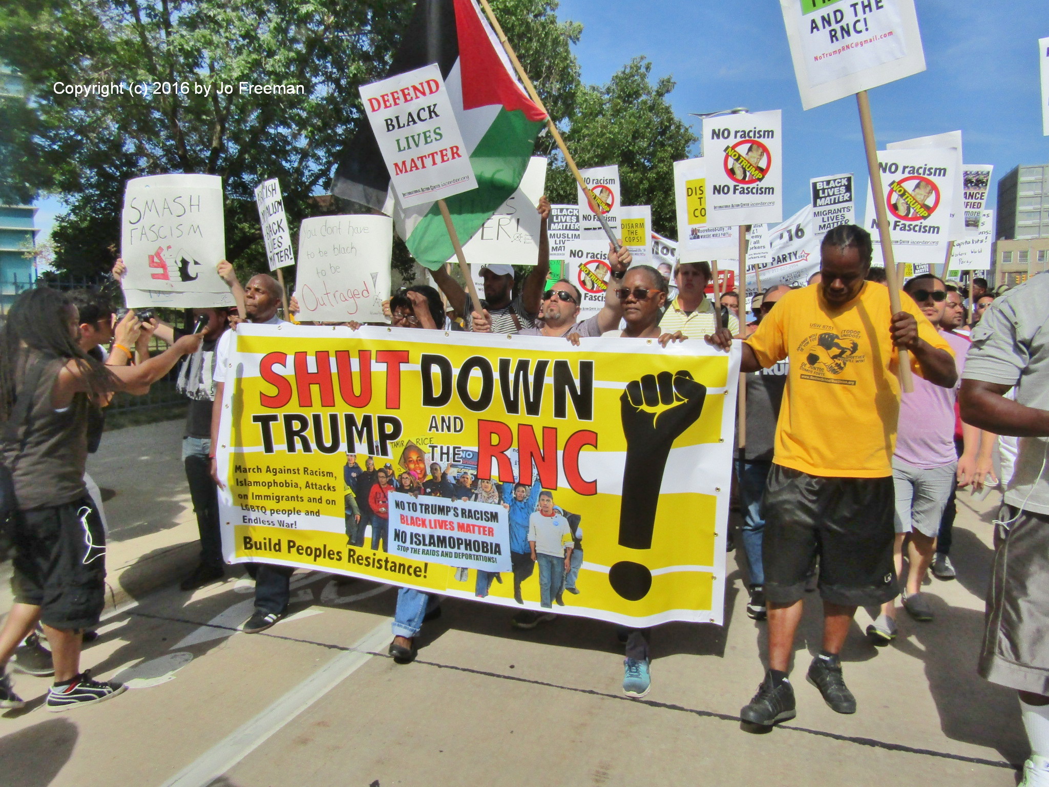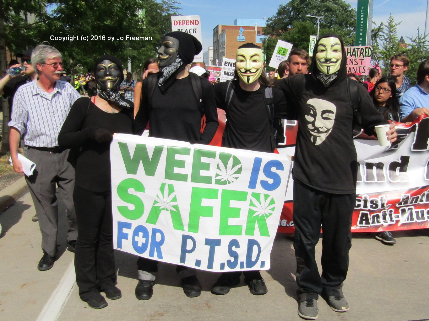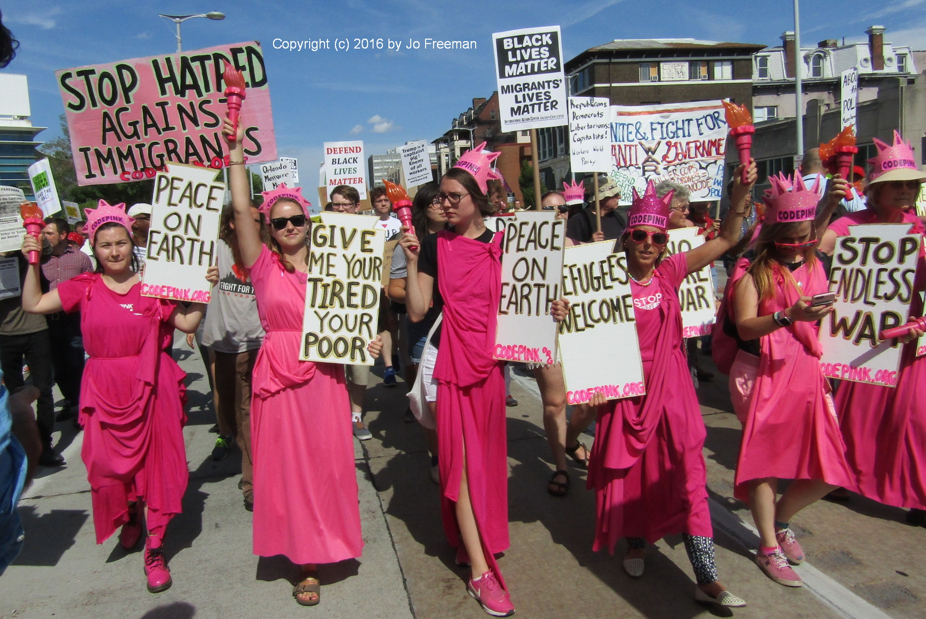 Following a banner reading “Shut Down TRUMP and the RNC” the marchers included a dozen “Ladies of Liberty” who were CodePinkers dressed in pink, four from the black block of Akron, OH, clothed in black from head to toe and wearing the plastic masks that became famous during the Occupy protests in 2011-12, lots of Black Lives Matter signs, mostly carried by whites, one banner on weed (Marijuana) and one young man in a red shirt that said CCCP, which is Cyrillic for USSR. Some things never end.