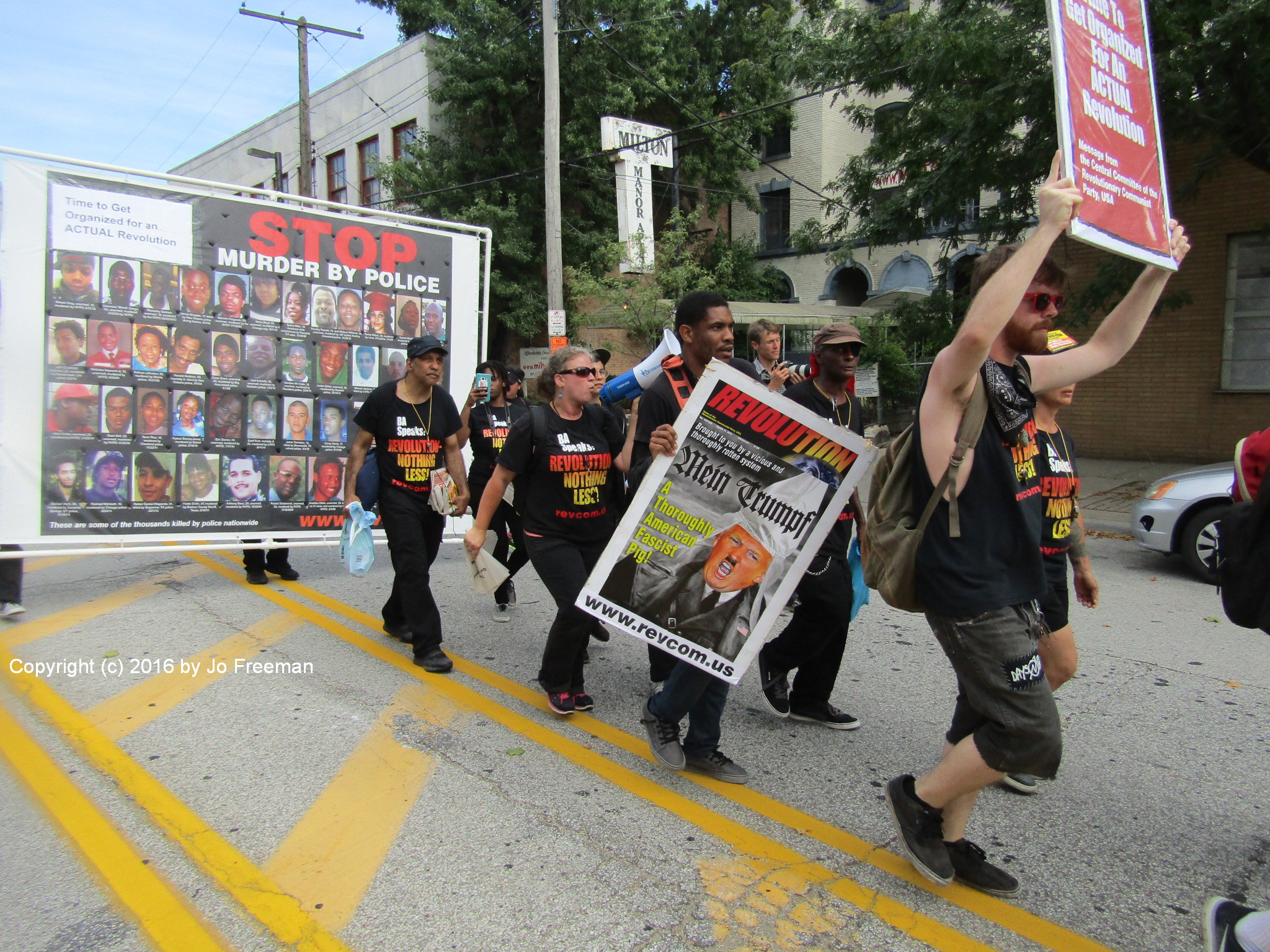 About 100 feet behind all the others were a dozen RCPers, proudly wearing their black t-shirts, holding a large banner with the faces of blacks shot by cops saying “STOP murder by police.”