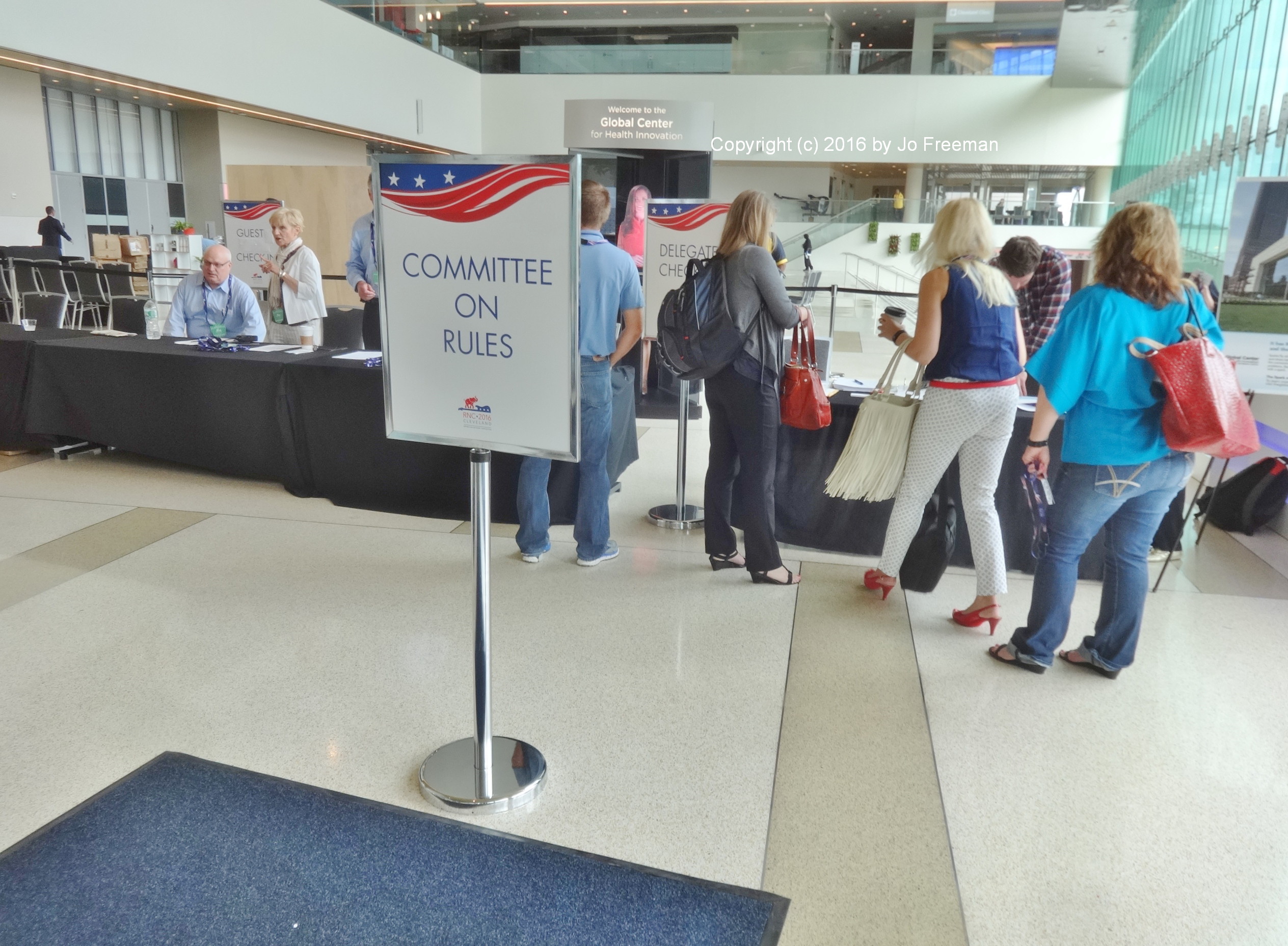 Probably to get rid of us, we were told to go to the media filing center at the Cleveland Convention Center (CCC) to watch the Rules Committee debates on a screen. There, security wouldn’t let us in because we didn’t have pre-convention passes. We were told to write and/or call Brigit Visconti who was at the Quicken Loans Arena (“Q”) where the actual Republican Convention would be held. Never got a reply.
