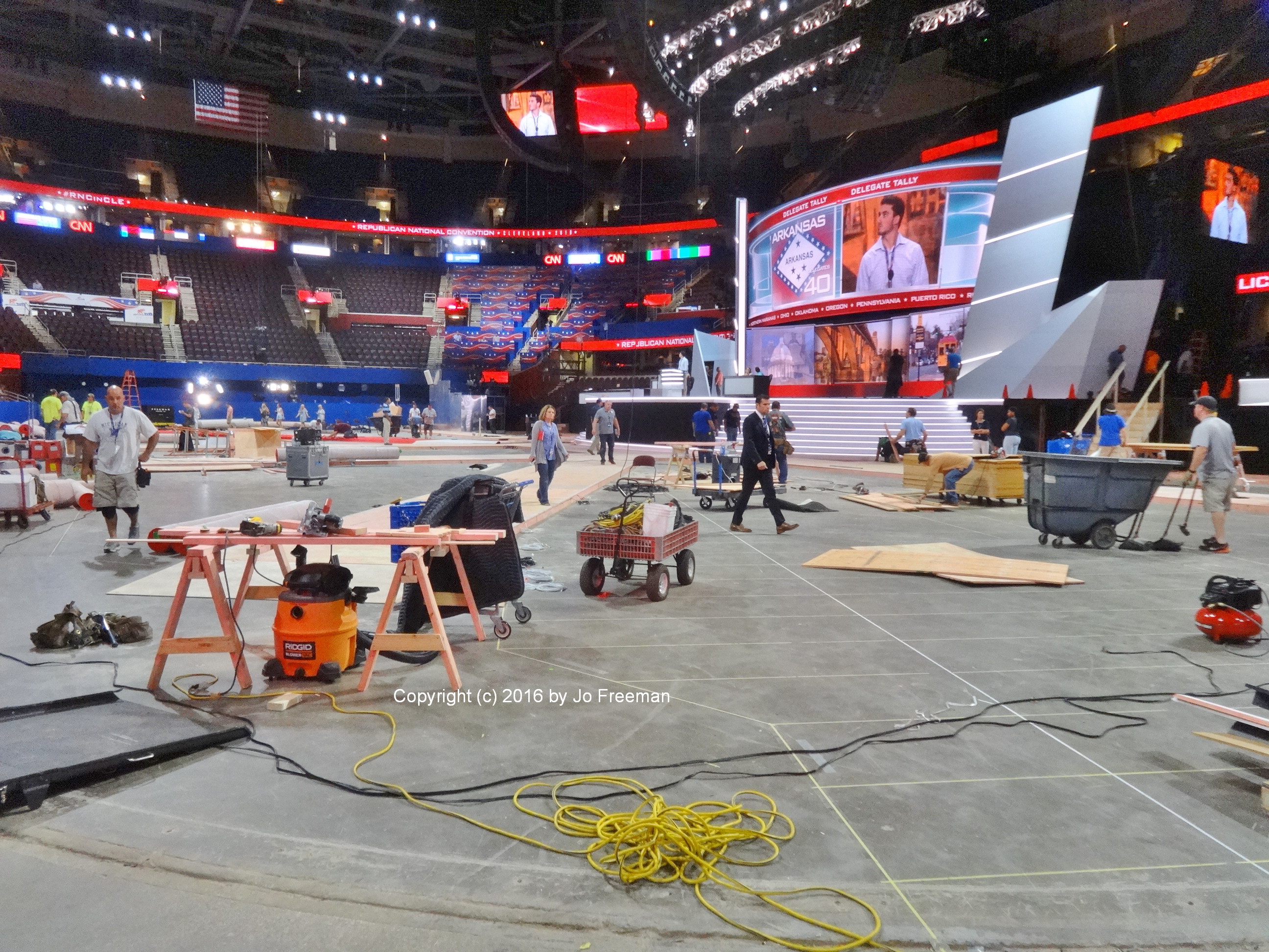 Saw lots of blue curtains partitioning off spaces for the major media who had paid for their spots. Didn’t see a lot of people. AT&T is providing space for the little media, but you have to pay for an internet connection. The CCC wifi was turned off. Nearby, Fox News paid for ballrooms about the size of a football field and were decorating them with interview stages. I stood in an open door and took a couple shots – until security asked me to leave. You can’t take pictures of private space, he said.