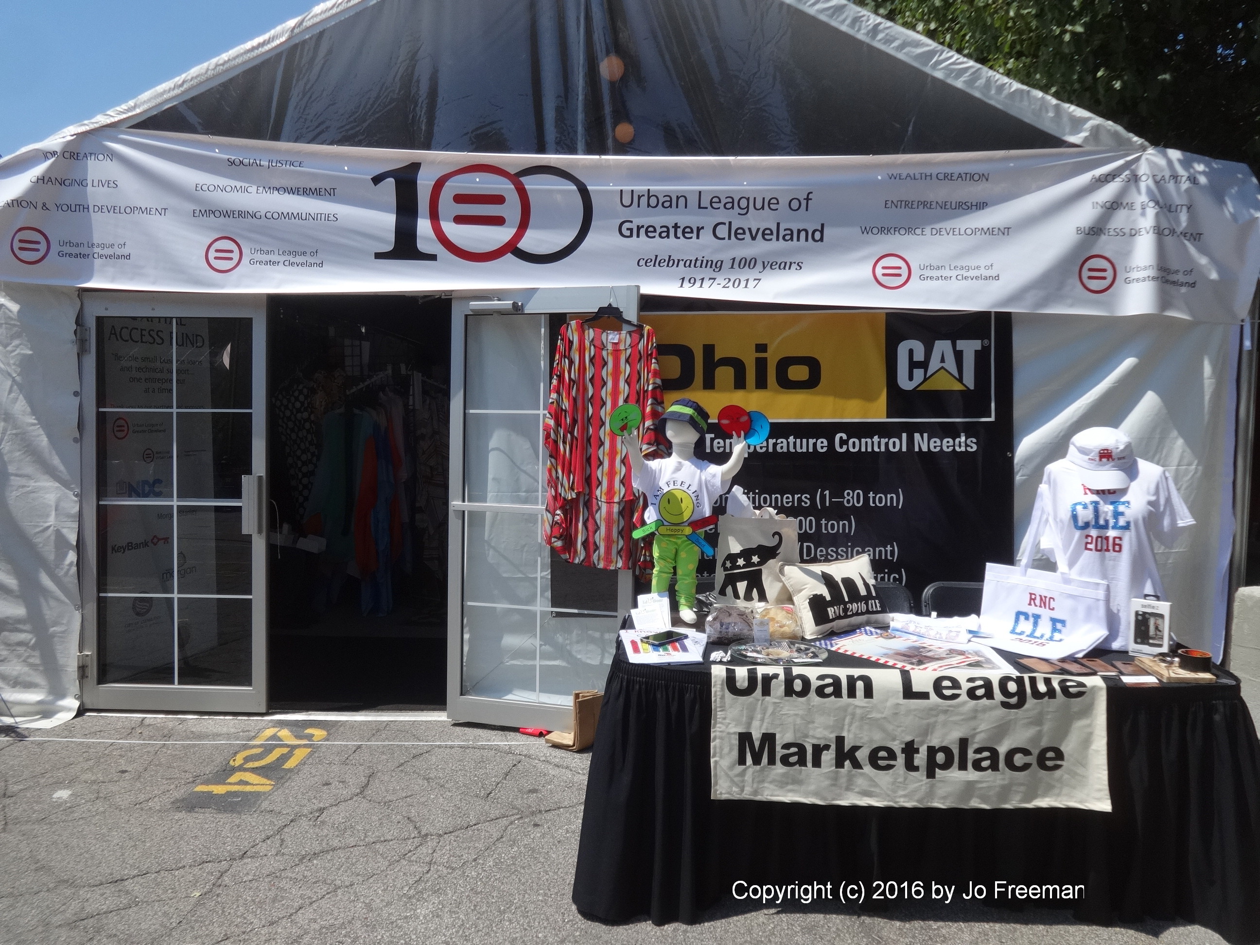 Diversity was also apparent in the Pennsylvania Convention Center (PCC) where about 50 advocacy groups set behind tables to spread their ideas and recruit supporters. Space was free, though they did have to apply for it well in advance of the convention. The closest equivalent at the Republican Convention was a Freedom Market where vendors sold their wares, usually with Republican themes. This was inside the security zone, so only those with credentials could shop. The PCC was open to the public, though everyone had to go through a search to get in. Freedom Market vendors paid $500 for their space. I asked if they were making money; most said that they were breaking even. The only group that set up shop in both cities was the Urban League. In Cleveland it paid for space for a large tent and subleased space to its members who had something to sell. In Philadelphia, it had a table.