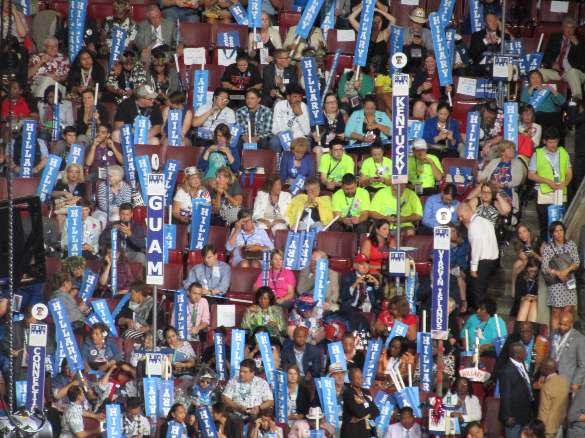 Nonetheless, Bernie’s delegates were much more visible in their opposition to Hillary than Republican delegates who did not like Trump. The latter accepted the decision of their Rules Committee and held their tongues. They did not carry signs for their conscience candidate and cheered along with everyone else for the nominee they did not like. Not so at the Democratic convention. Berniers shouted their opinions to the speakers even to the point of rudeness. When Hillary signs were passed out Thursday night to be waved by the crowd, they didn’t take them. Instead they waved other signs that had been passed out previously or sat on their hands. About one hundred Berniers wore day-glo chartreuse t-shirts so they were easy to spot, sitting while others were cheering for Hillary.