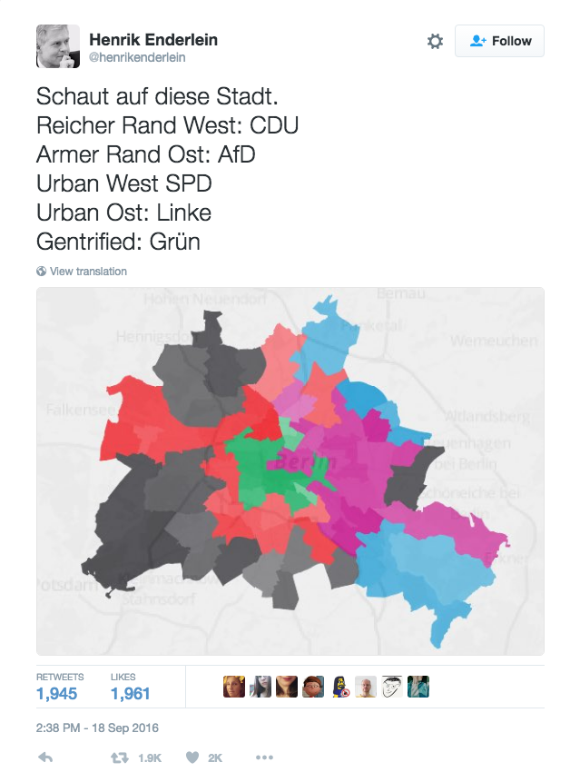 After last weekend’s local elections in Berlin, my more optimistic friends celebrate what they consider to be the victory of the left, while the pessimists (or realists, depending on who you ask) bemoan the ascent of the right-populist Alternative für Deutschland (AfD) who received 14.2% of the votes. At a quick glance, the election results paint a picture of a city divided into rich and poor peripheries, established urban cores, and a gentrified center. Yet Berlin is not an archipelago and thinking about its individual neighborhoods as islands is intellectually lazy. Not only does marking Berlin’s eastern neighborhoods as strongholds of nationalists further stigmatize them, it also overlooks the growing popularity of the AfD across the entire city (and the country, for that matter), and that includes its more affluent corners. As this interactive map of the election results demonstrates, the picture is much more nuanced than it may first appear. Studying it in greater detail is essential in apprehending the scale and complexity of the growing popularity of racist, Islamophobic, anti-immigrant, and anti-refugee rhetoric and practices — a development not limited to selected Berlin neighborhoods or German regions, but detectable across Europe and beyond.