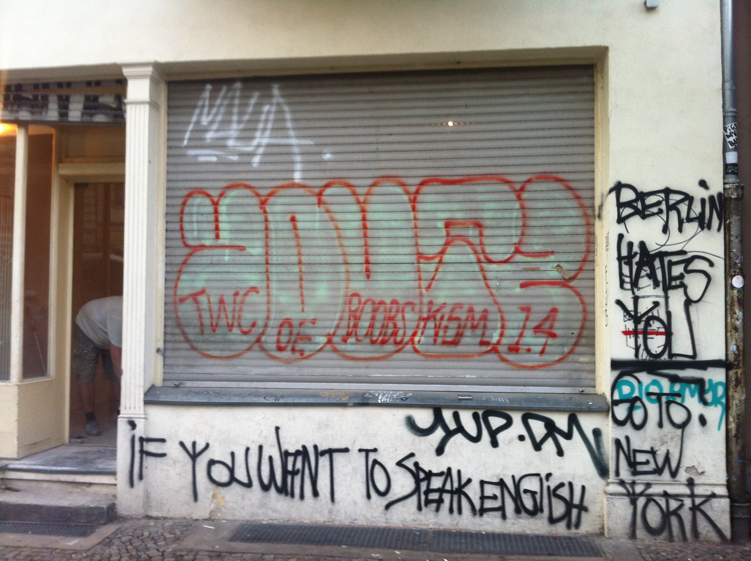 Xenoglossophobia, the fear or hate of foreign languages — is not an exclusively right-wing phenomenon. As Berlin’s gentrification and touristification reach unprecedented heights, much of the left-wing anti-gentrification and anti-touristification rhetoric is more likely to be directed at international newcomers identified as gentrifiers, rather than at the local political mechanisms and global economic structures that enable gentrification in the first place. Judging by the literal writing on the wall, the sound of English is particularly identified as a hostile takeover of urban space. A typical piece of graffiti in Kreuzberg, for instance, encourages people to go to New York if they want to speak English; another popular sign proclaims: Berlin hates you. So much for the German Willkommenskultur.