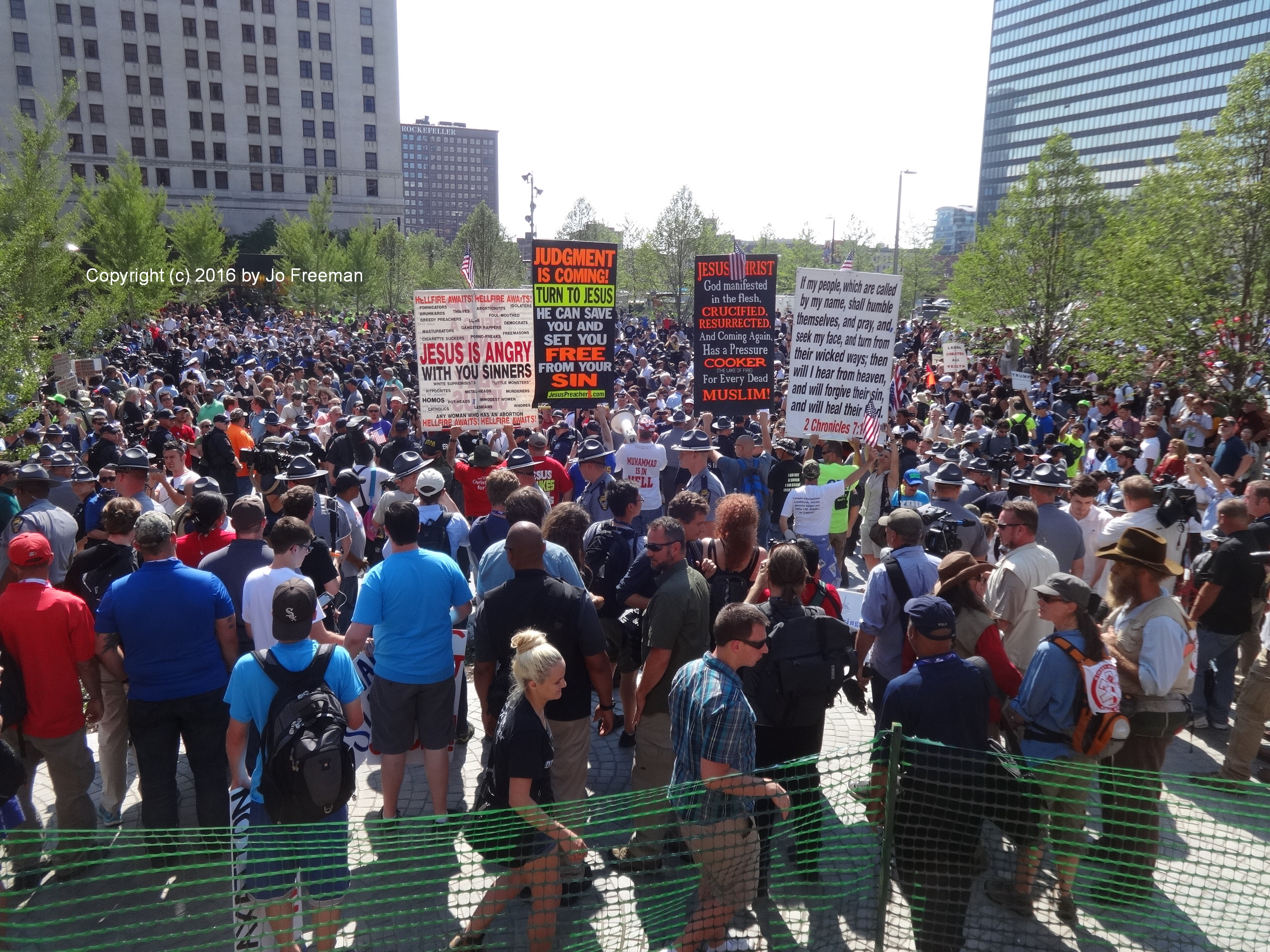 Long ago the federal courts ruled that there had to be an official protest zone within sight and sound of the convention hall. In lawsuits before each convention the parties work out the time, place and manner details, or let the courts do it. Cleveland was a bit different in that the official protest zone was not within sight and sound of the Q. It was in the Public Square in downtown Cleveland, dominated by a gigantic Civil War monument.