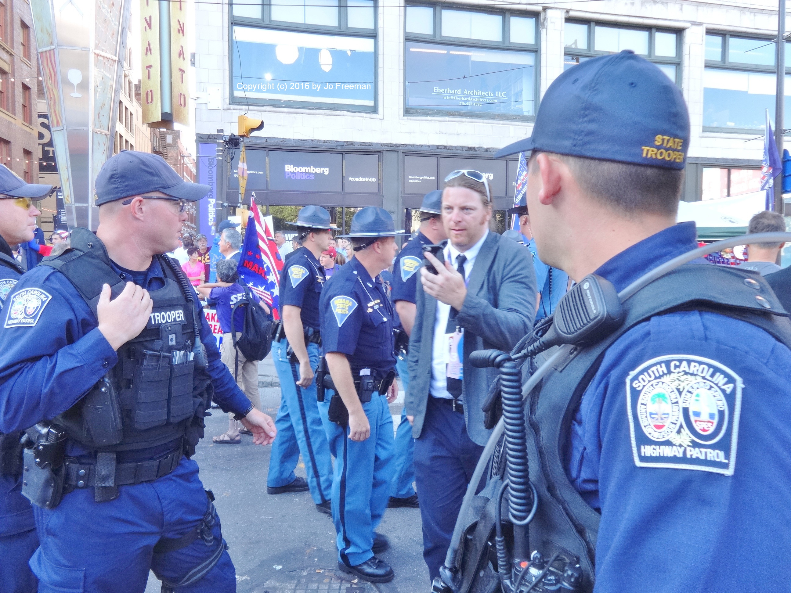 Every four years Congress gives each city hosting a major party convention $50 million dollars to protect the convention and police the protestors. They usually use it to bring in cops from across the country. In Cleveland I saw shoulder patches from the California, Florida, and South Carolina Highway patrols, as well as police from Michigan, Atlanta, Indiana, and all over Ohio. I counted 15 locales, and believe there were more than that. We were told that 500 Cleveland police and 2,800 police from elsewhere were keeping the protests peaceful. They slept in the dorms of the local colleges and were moved around in local school buses.