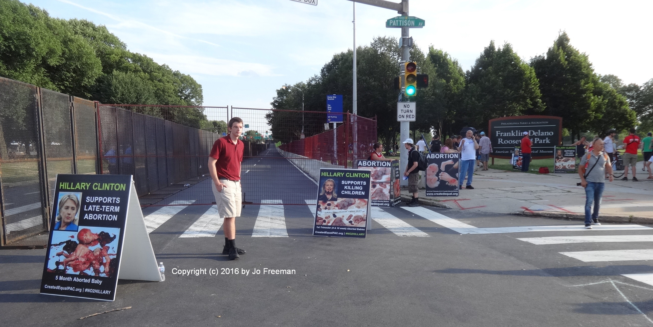 The official protest zone in Philadelphia was in FDR park, across the street from the Wells Fargo Center (WFC). It was a nice, large park. But while it was technically within sight and sound of the WFC, the streets were bounded by the 8 foot fences and the busses carrying delegates came in the other side.