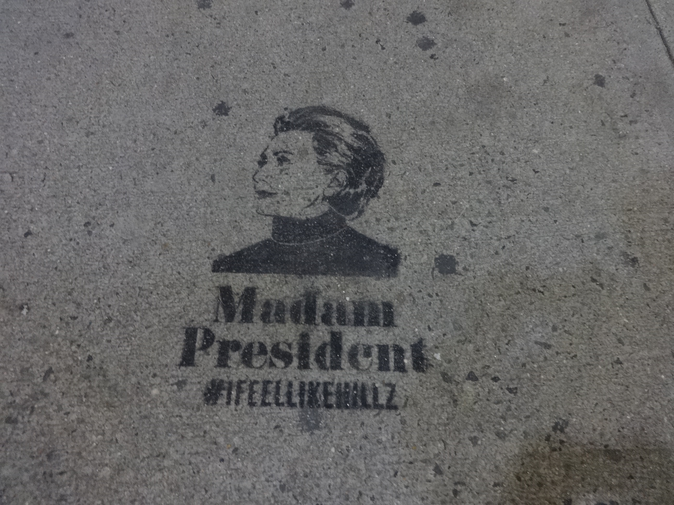 As I walked down 34th St. from the subway exit on Tuesday evening, I could see stenciled into the sidewalk Hillary Clinton’s head and the words “Madame President #IFEELLIKEHILLZ. I saw a good half dozen of these before I got to the Javits Center. There was a barricade at 10thAve. 34th. Police said they were only letting in those with some sort of special ticket. The staff member answering questions said that entrance was only for staff, VIPs and press. I wasn’t any of those. However, since I wasn’t press, I had decorated my press vest with a dozen different Hillary pins that I had picked up at or since the Convention. On my head was a cap that said Hillary for President 2008. I looked like I belonged inside the Javits Center with the rest of the celebrants.