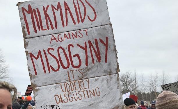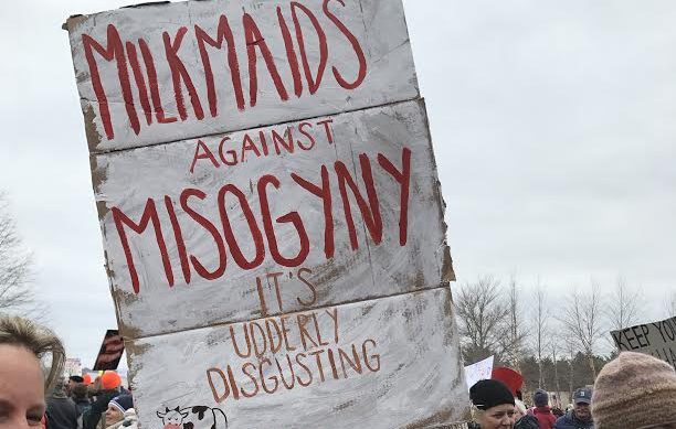 Augusta’s marchers were mostly white, with a wide age range. There were seven twenty-something women with a huge sign bearing a Susan B. Anthony quote, a bearded elderly man with a VFW hat next to a child with a pink pussy cap, and many in-between. Native American women chanted in Penobscot as they drummed. Not only was the crowd remarkably polite, but signs also promoted those values. One simply urging “Ethics! Tolerance! Civility!” Others read, “Build kindness, not walls,” “Compassion is the radicalism of our time” and “Make America kind again.”