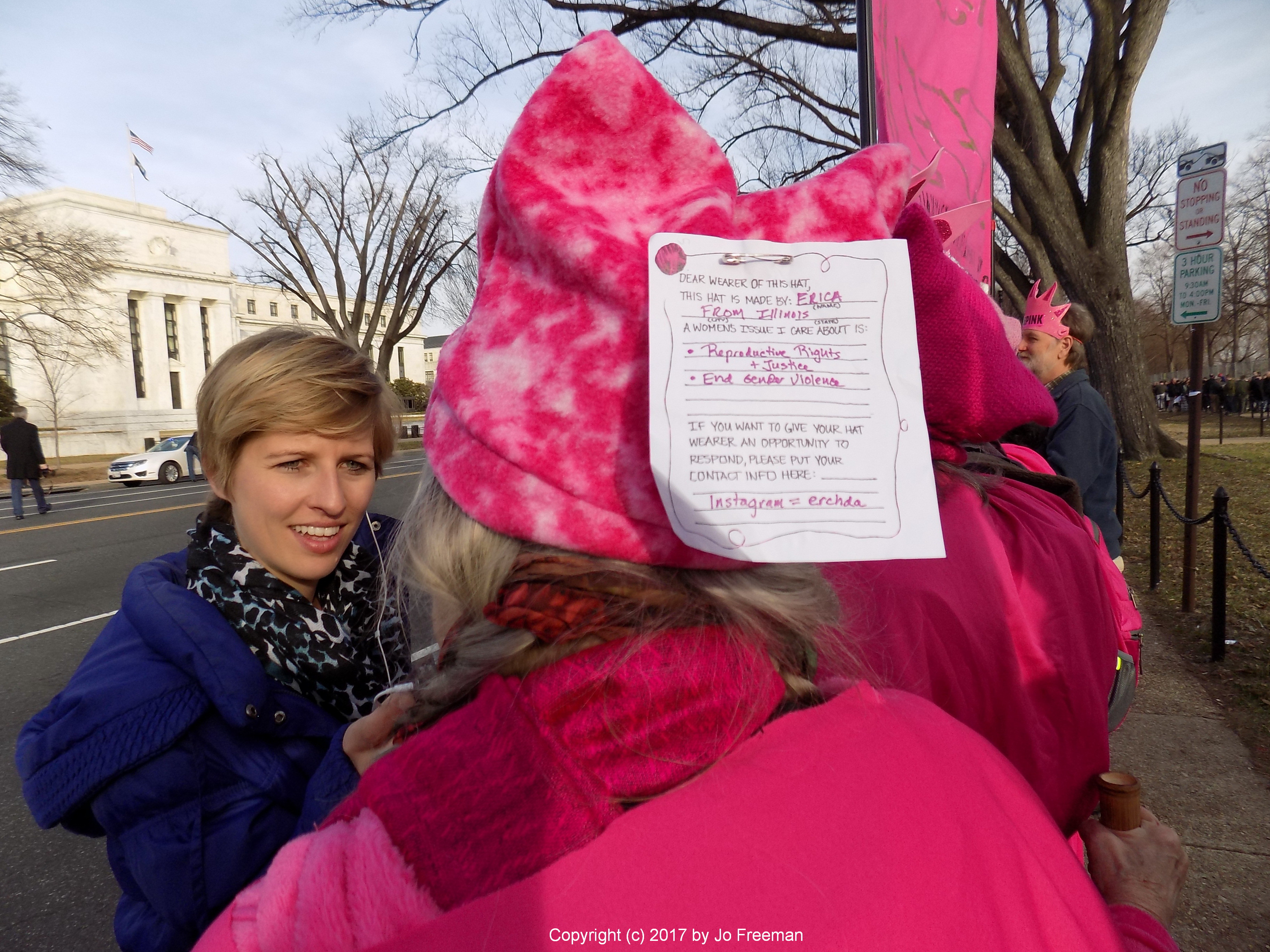 After about an hour of standing in front of the concert line they walked down the street, attracting even more attention and press interviews. They passed out pink pussy hats for women to wear at the Women’s March on Washington on Jan. 21 to the many women who said they were supporters. Knitted by women all over the country, CodePink has 5,000 to pass out. Inside each one is a little note identifying the maker. Mine was made by Pam in Sturgeon Bay Wisc. The hats are a way of protesting Trump’s assaults on women by grabbing their pussies.