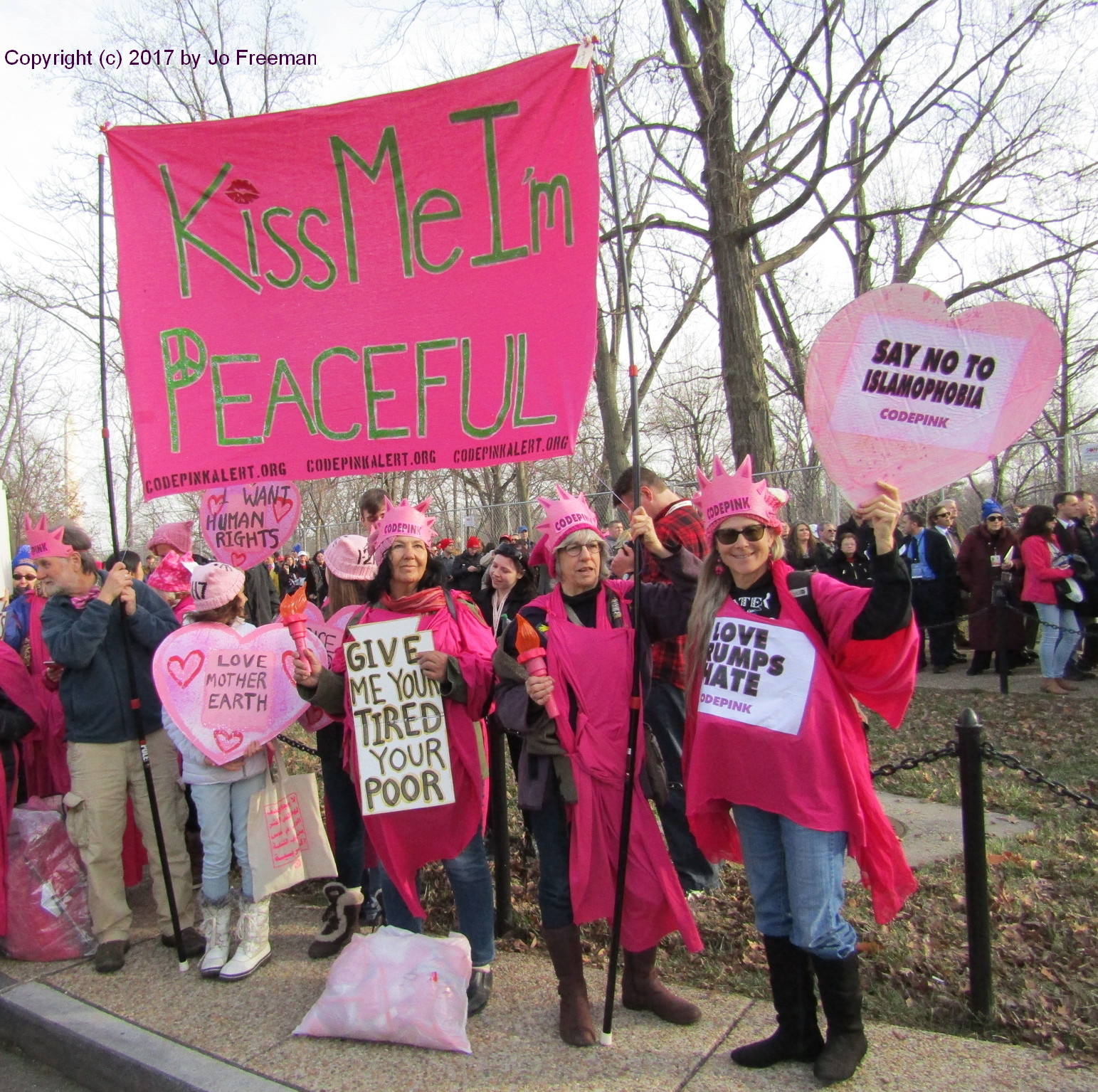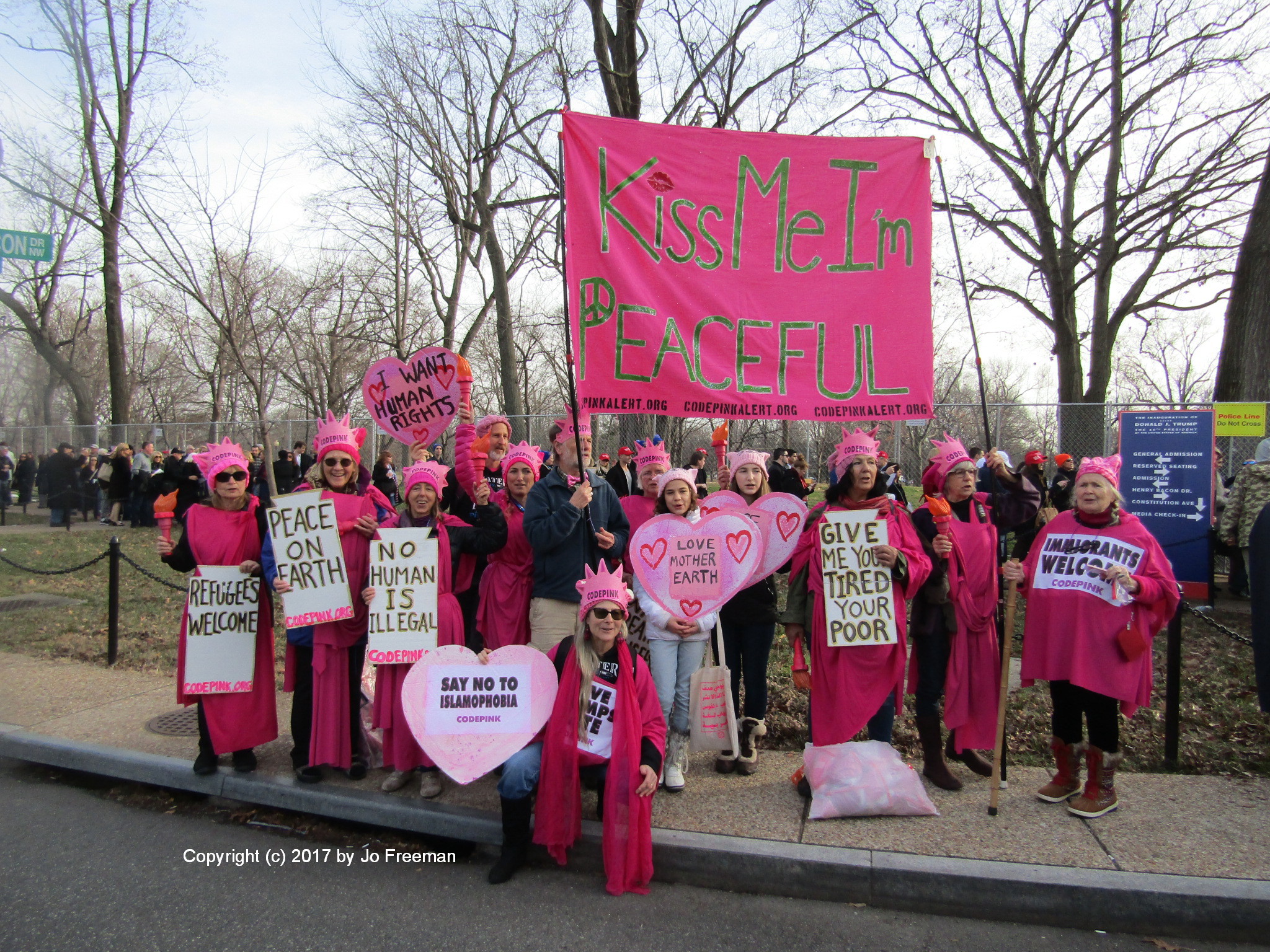 Protests at the 45th inaugural began the day before when CodePink, the women-led anti-war group congregated at the line to the inaugural concert to display their signs. Holding a banner that said “Kiss Me, I’m Peaceful,” about a dozen pink Ladies of Liberty promoted several issues. Currently these have more to do with immigration than war. Signs said “no human is illegal” and “refugees welcome.”
