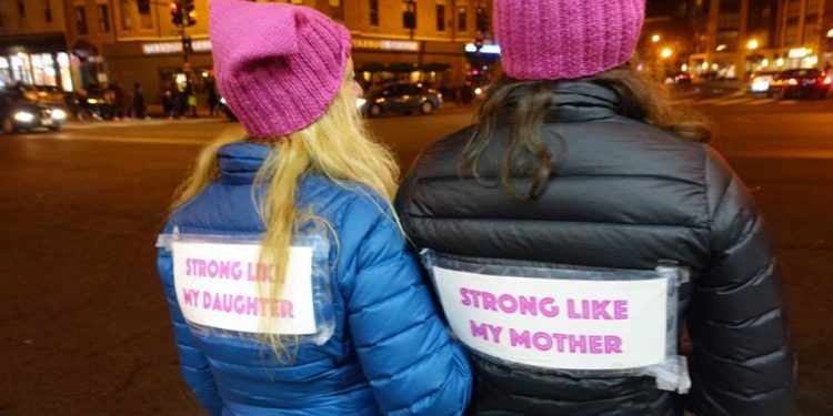 - When we came up behind a mother and daughter with their arms around each other, wearing banners that said: “Strong like my mother,” and “Strong like my daughter.”