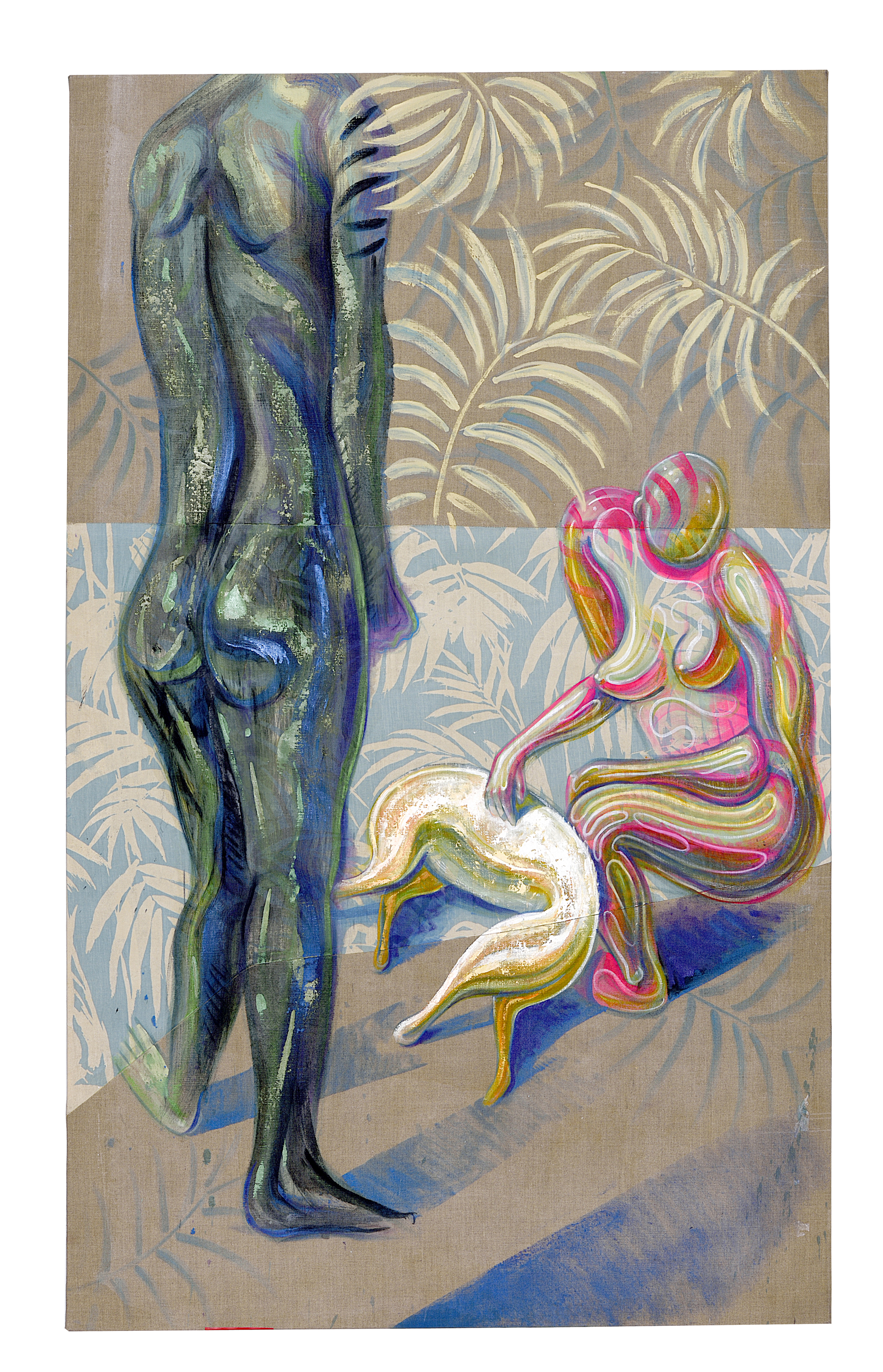 I’m looking through archives of subjects that I find relevant to this exhibition in particular, and I’m re-appropriating those images. Whether it’s deliberately intervening on top of a photograph in the Tribalphilia series, or I’m using photography as an inspiration and I’m montaging different images, photographic images, in the form of an oil painting. Nonetheless, what my intention is, like Jamieson Webster and Chiara Bottici were saying, to reconfigure the way in which images convey meaning, not as an objective sort of “this is the truth,” but more to pose a question with the artwork and then the answer is only in terms of the individual subjective interpretation of the painting. That’s sort of how I was thinking about this exhibition.
