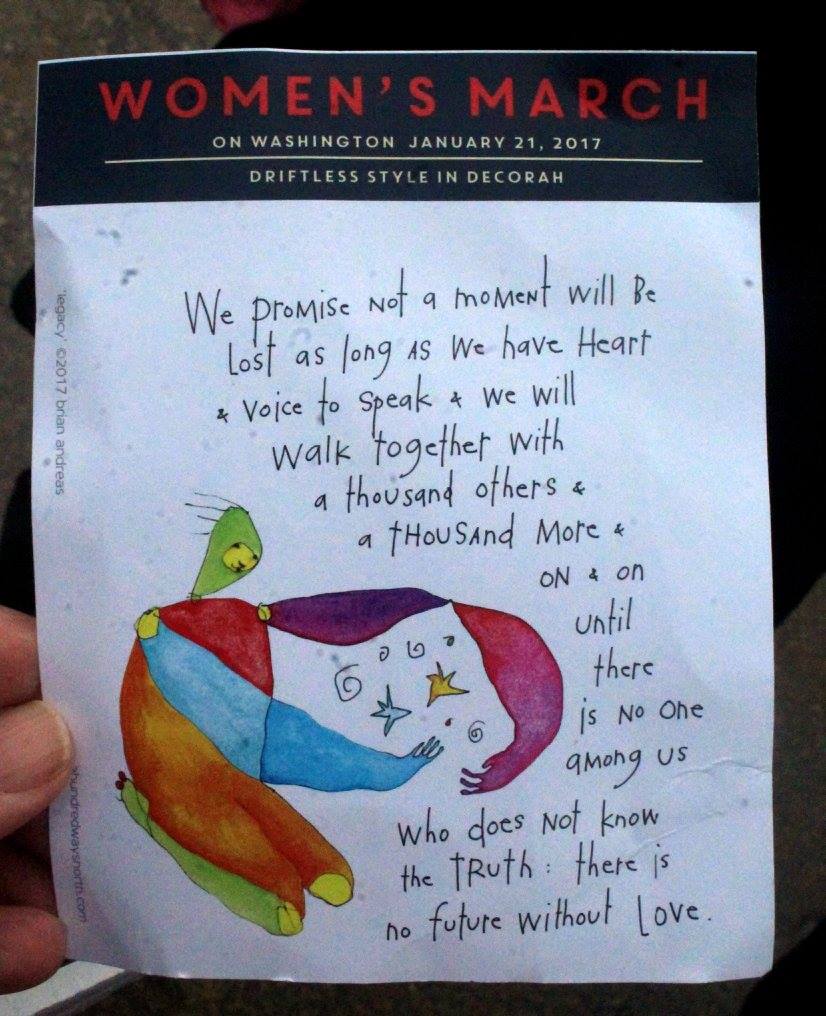The day of the march dawned gloomy, a warmish mid-40s, and with a threat of rain. As we stopped in a local coffee shop for caffeine fortification, we saw many friends, neighbors, and (amazingly) people we didn’t recognize walking with signs, pink hats, and eager anticipatory smiles. We gathered in a gravel driveway next to an ice and snow clogged park. Around us were people greeting friends and neighbors. The nationally known local artist Brian Andreas of “The Story People” handed out commemorative prints. Alongside one of his signature colorful people, the print said, “We promise not a moment will Be lost as long as we have Heart + voice to speak + we will walk together with a thousand others + a thousand more + on + on until there is no one among us who does not know the Truth: There is no future without Love.”