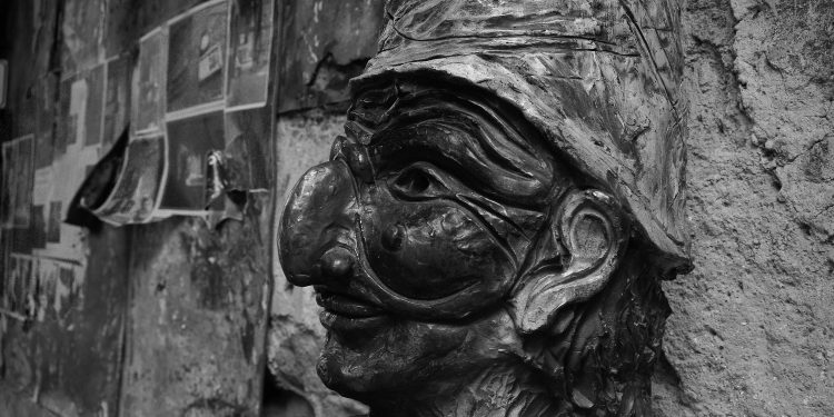 The villain was often Pulchinella, a blend of servant and master, he of the big stomach. He wore a big white blouse buttoned over the stomach and a belt buckled under it, from which hung a coin purse. Everyone understood that the coins made him callous and cruel.