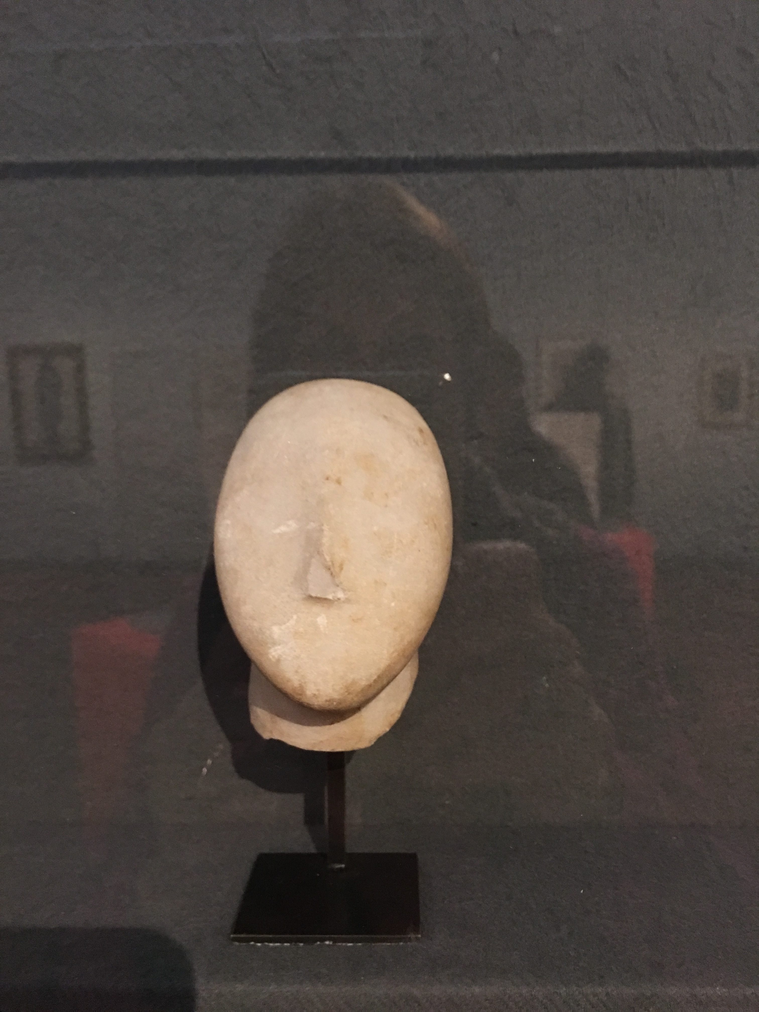 At the Modigliani exhibition I photographed one Cycladic head in a clear plastic box — it was just a white disc, mounted on a stem. No eyes or mouth, but you didn’t need them to know it was a face. In the photograph I’m a shadow holding up my iPhone behind the white face.