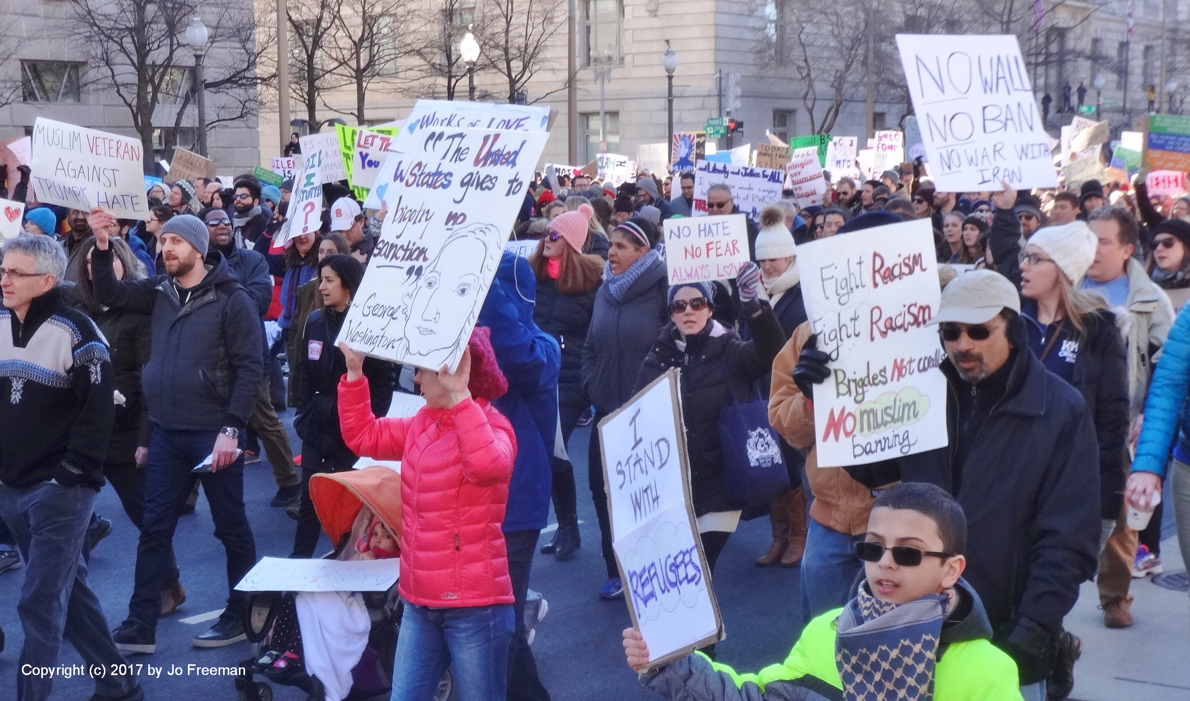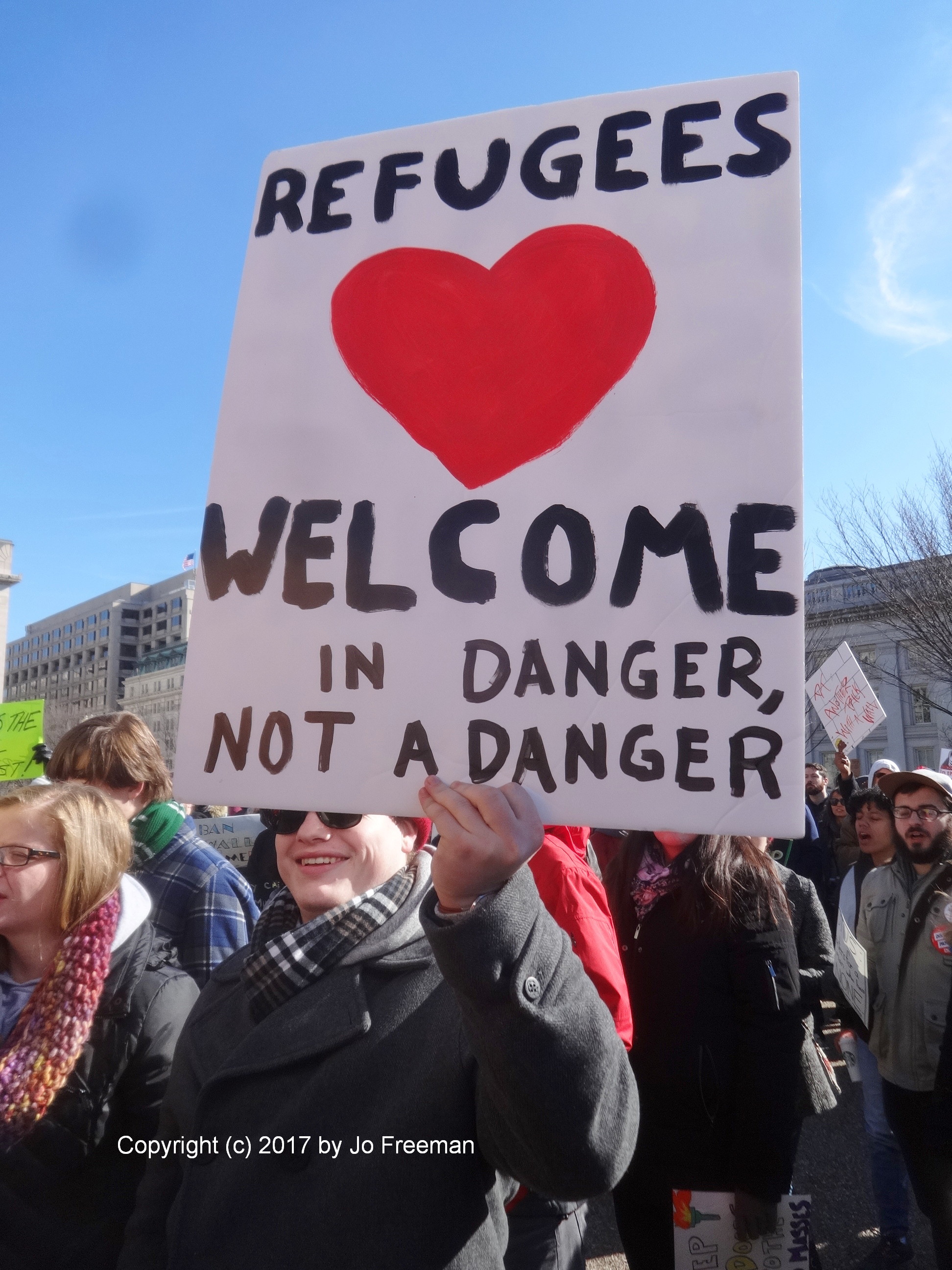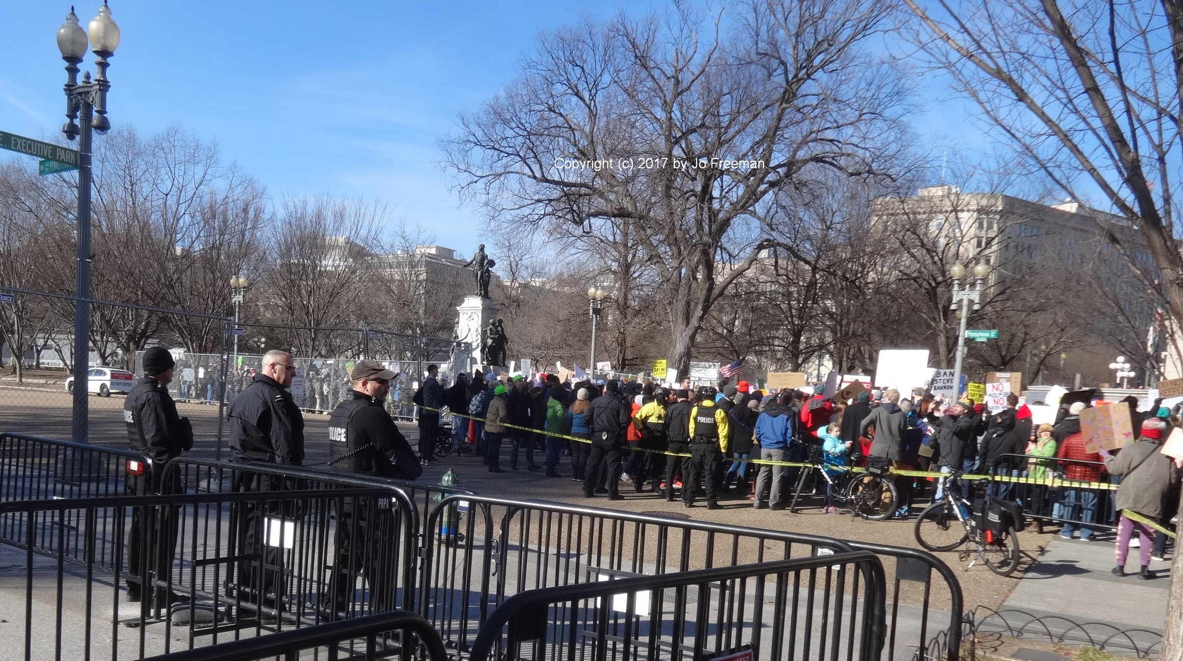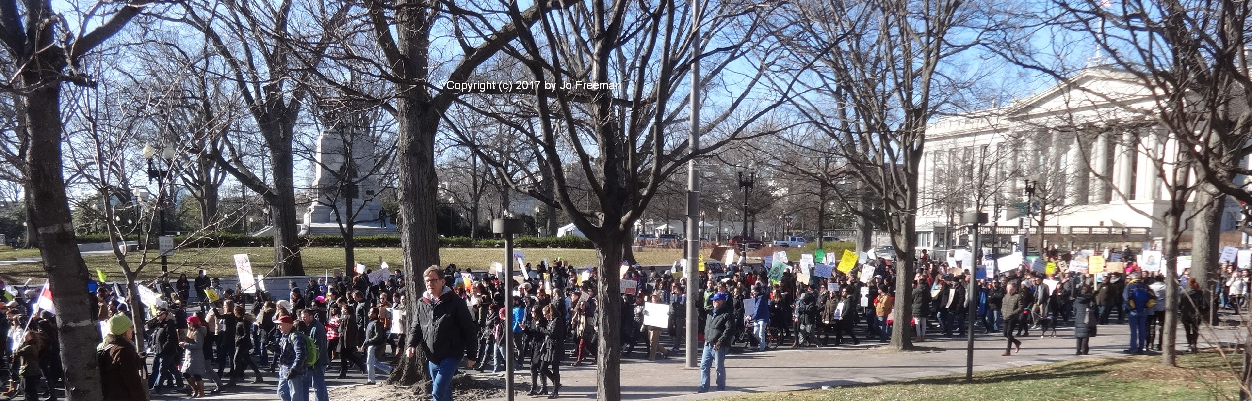 Roughly five thousand people gathered at the edge of Lafayette park across from the White House on Sunday afternoon, February 4. They were protesting the ban on Muslims and refugees proposed by President Trump January 27. “No hate no fear, refugees are welcome here!” was the most popular chant. Most of the area was still chained off so that the inaugural stands could be deconstructed. After an hour’s rally, the crowd marched down Pennsylvania Ave. toward the Capitol, led by the DC police.