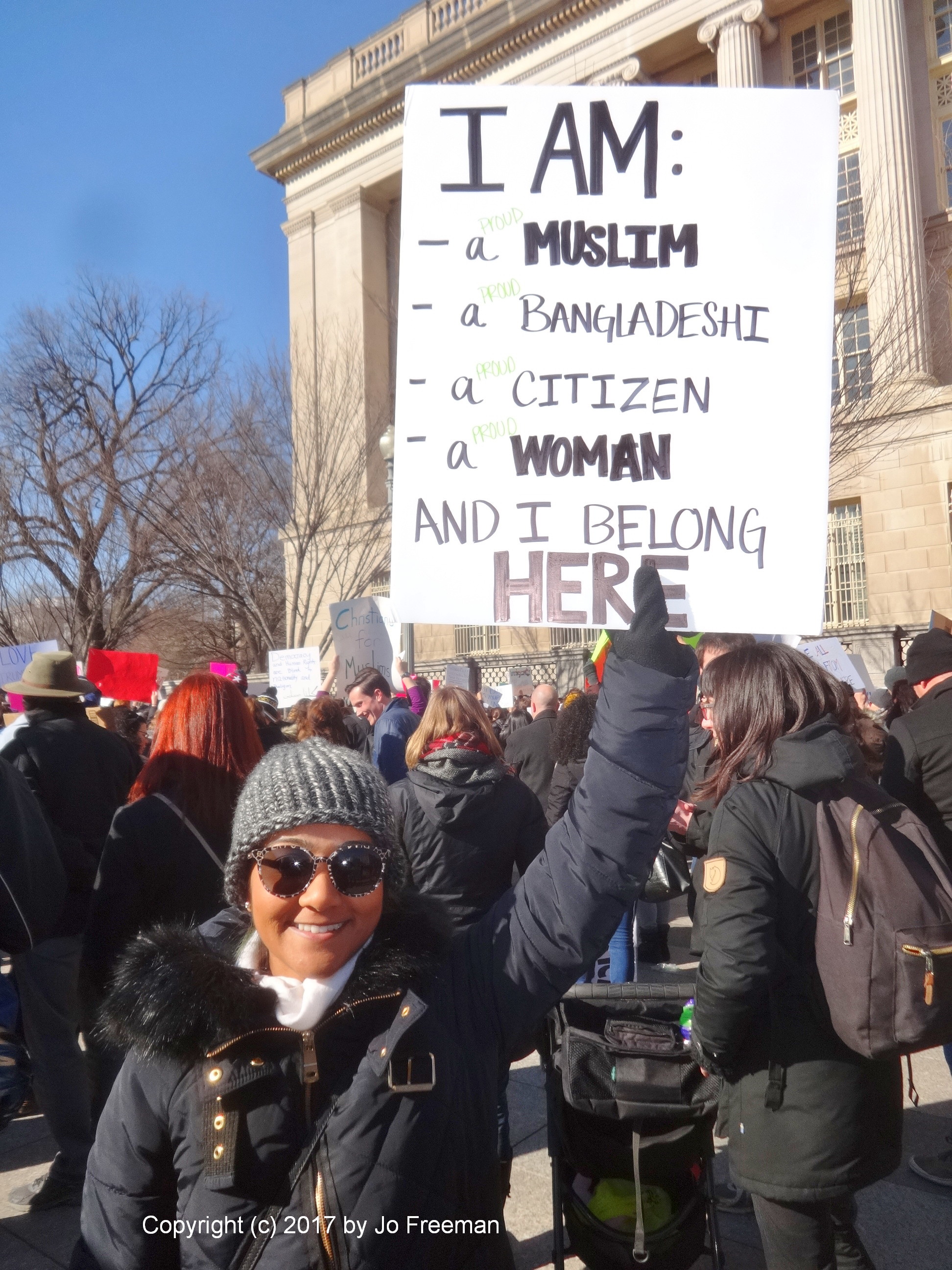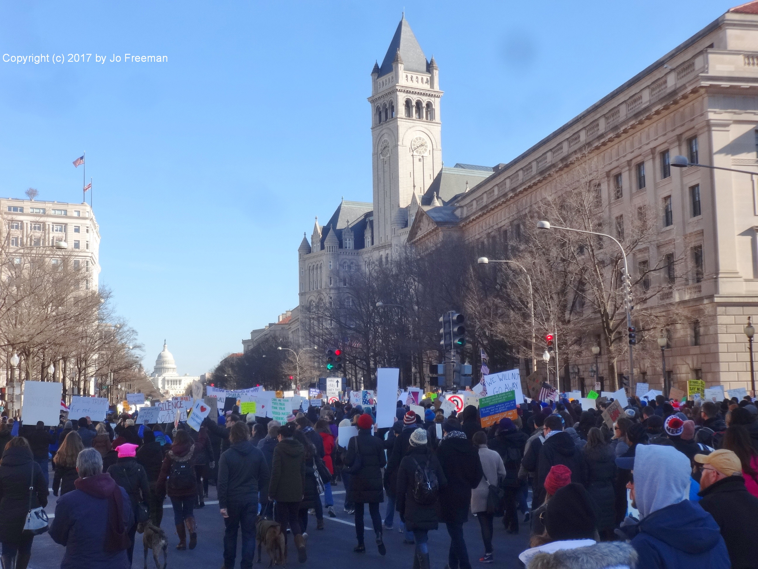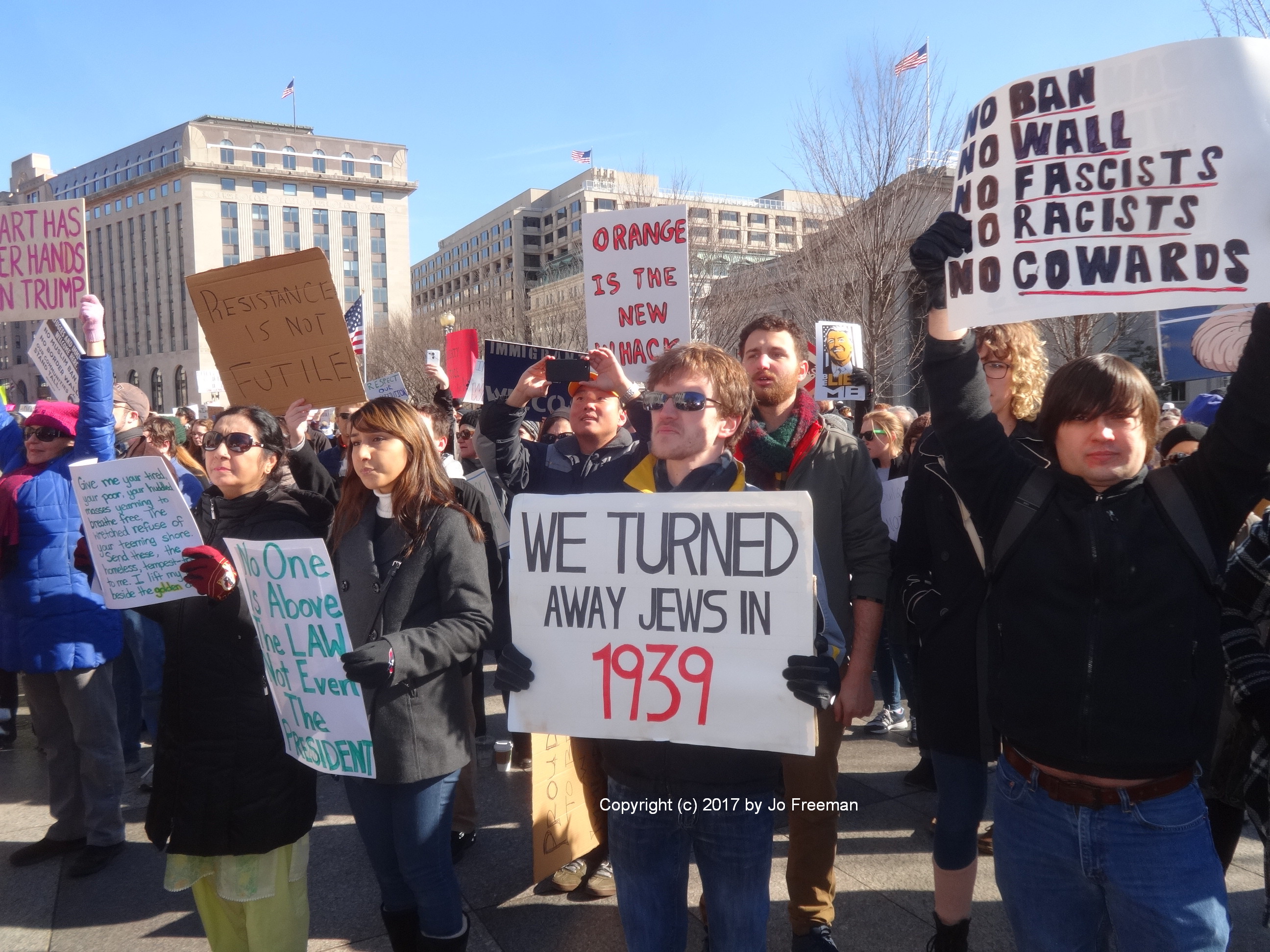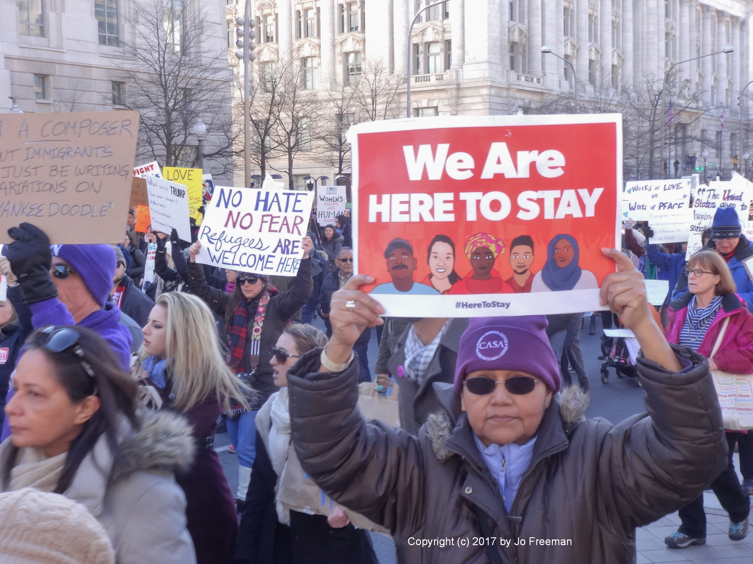 Roughly five thousand people gathered at the edge of Lafayette park across from the White House on Sunday afternoon, February 4. They were protesting the ban on Muslims and refugees proposed by President Trump January 27. “No hate no fear, refugees are welcome here!” was the most popular chant. Most of the area was still chained off so that the inaugural stands could be deconstructed. After an hour’s rally, the crowd marched down Pennsylvania Ave. toward the Capitol, led by the DC police.