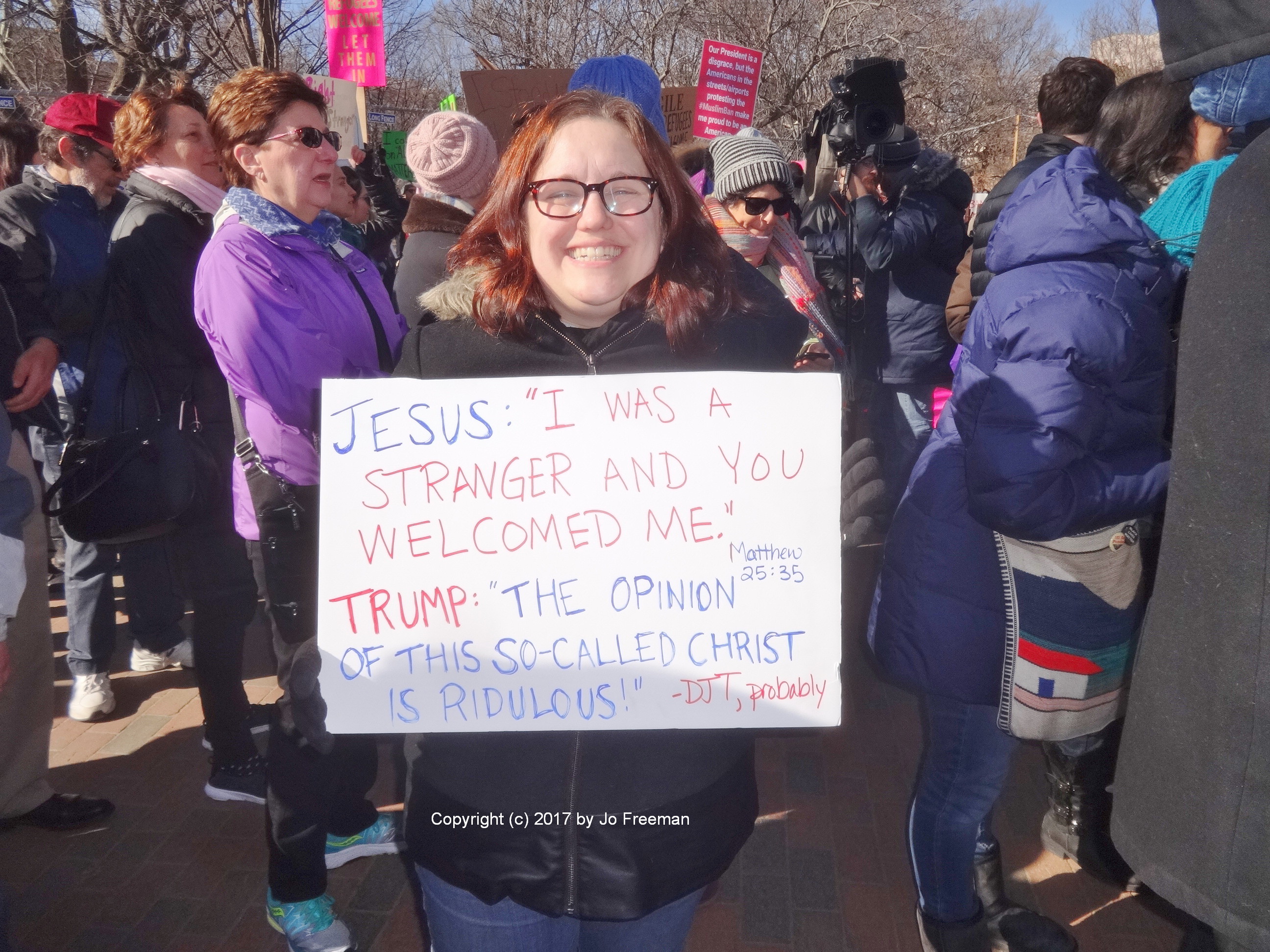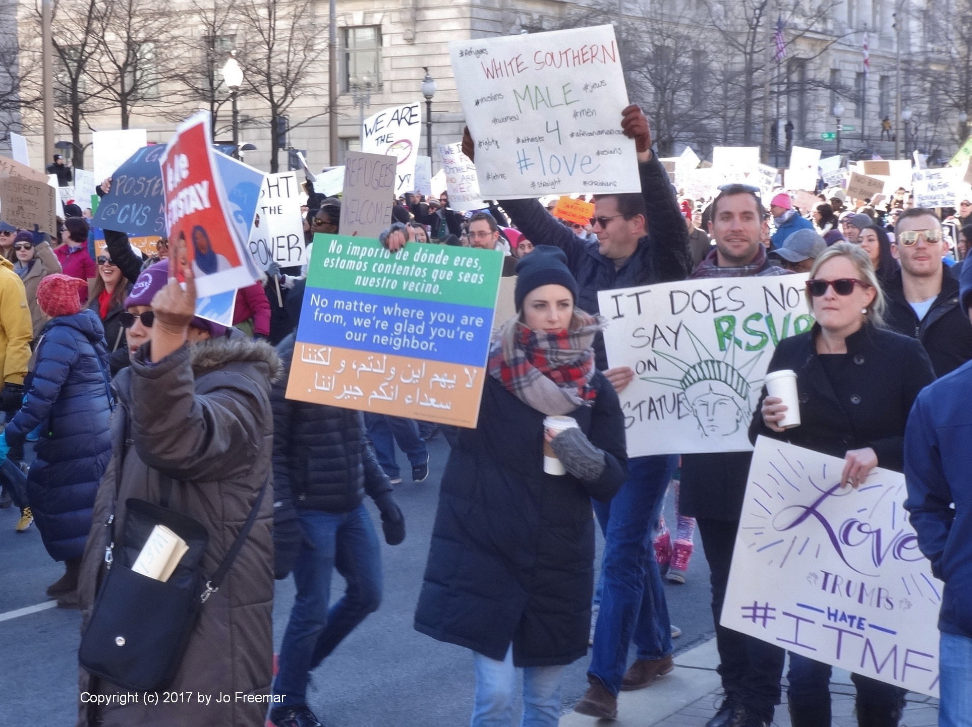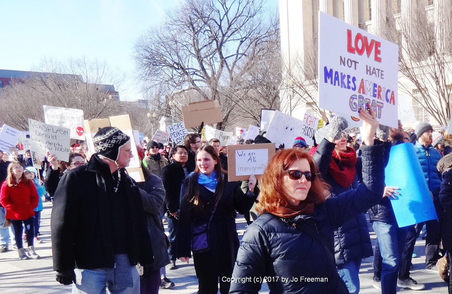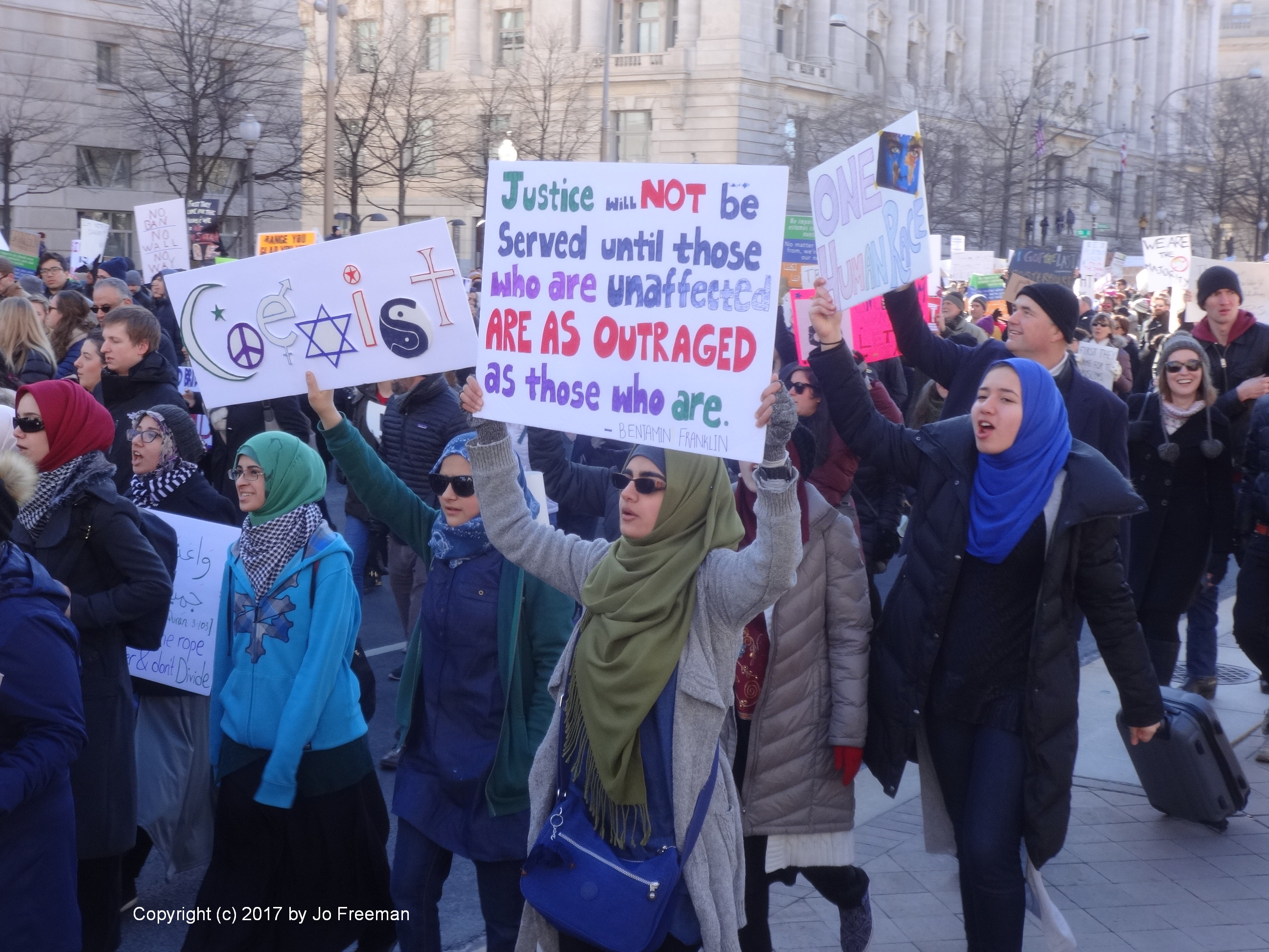 Roughly five thousand people gathered at the edge of Lafayette park across from the White House on Sunday afternoon, February 4. They were protesting the ban on Muslims and refugees proposed by President Trump January 27. “No hate no fear, refugees are welcome here!” was the most popular chant. Most of the area was still chained off so that the inaugural stands could be deconstructed. After an hour’s rally, the crowd marched down Pennsylvania Ave. toward the Capitol, led by the DC police.