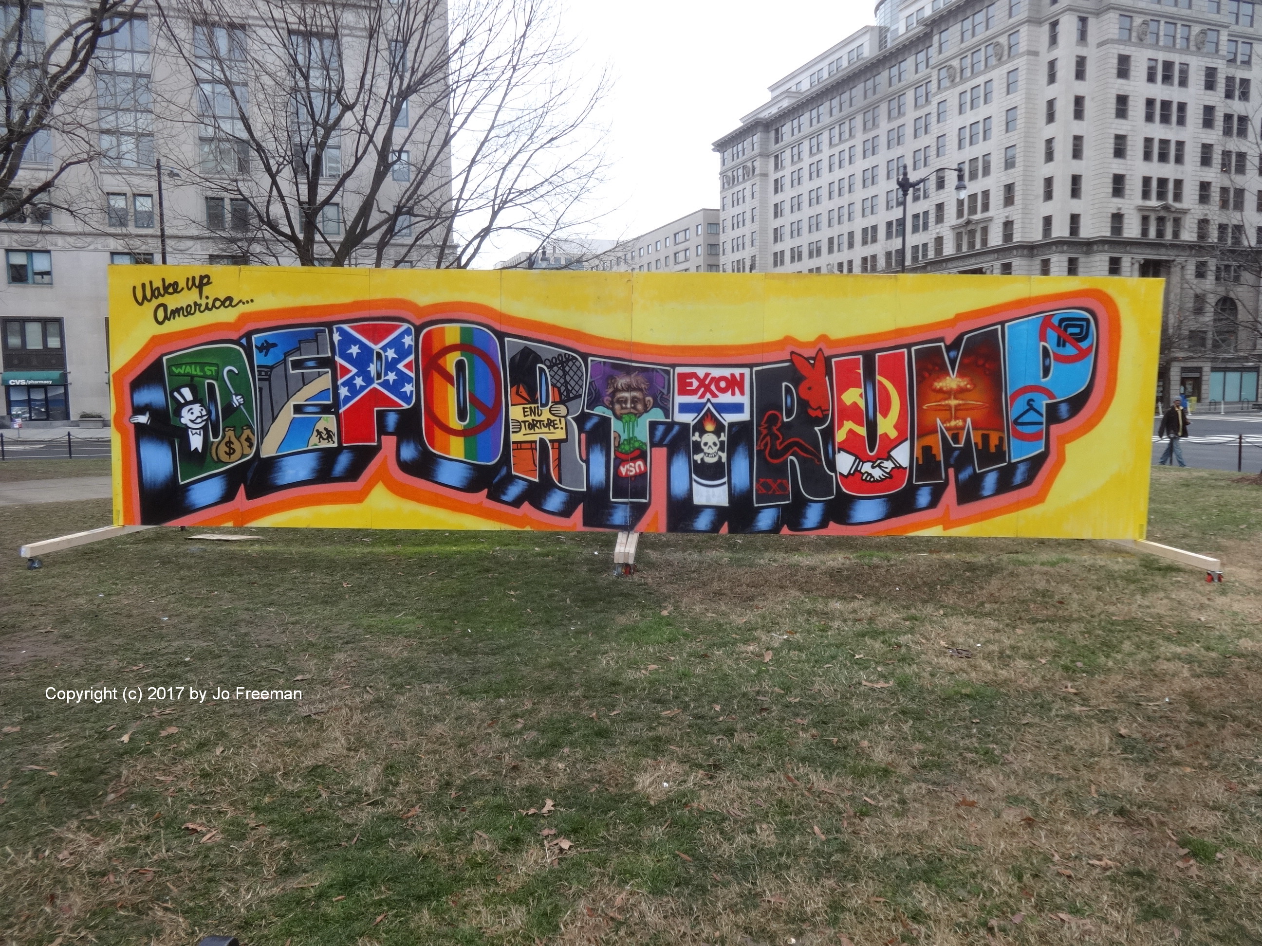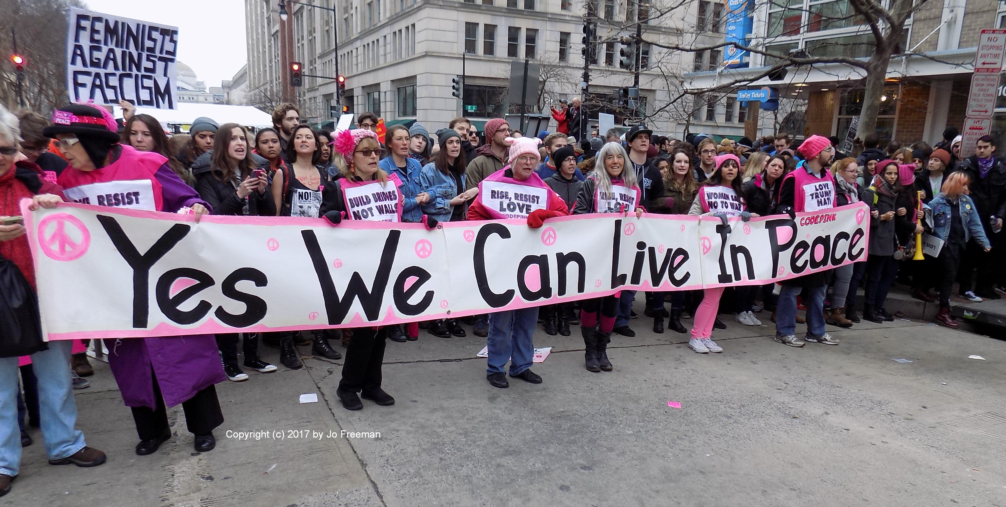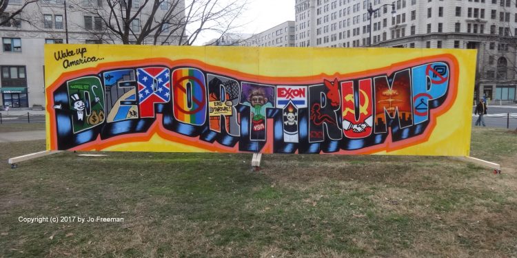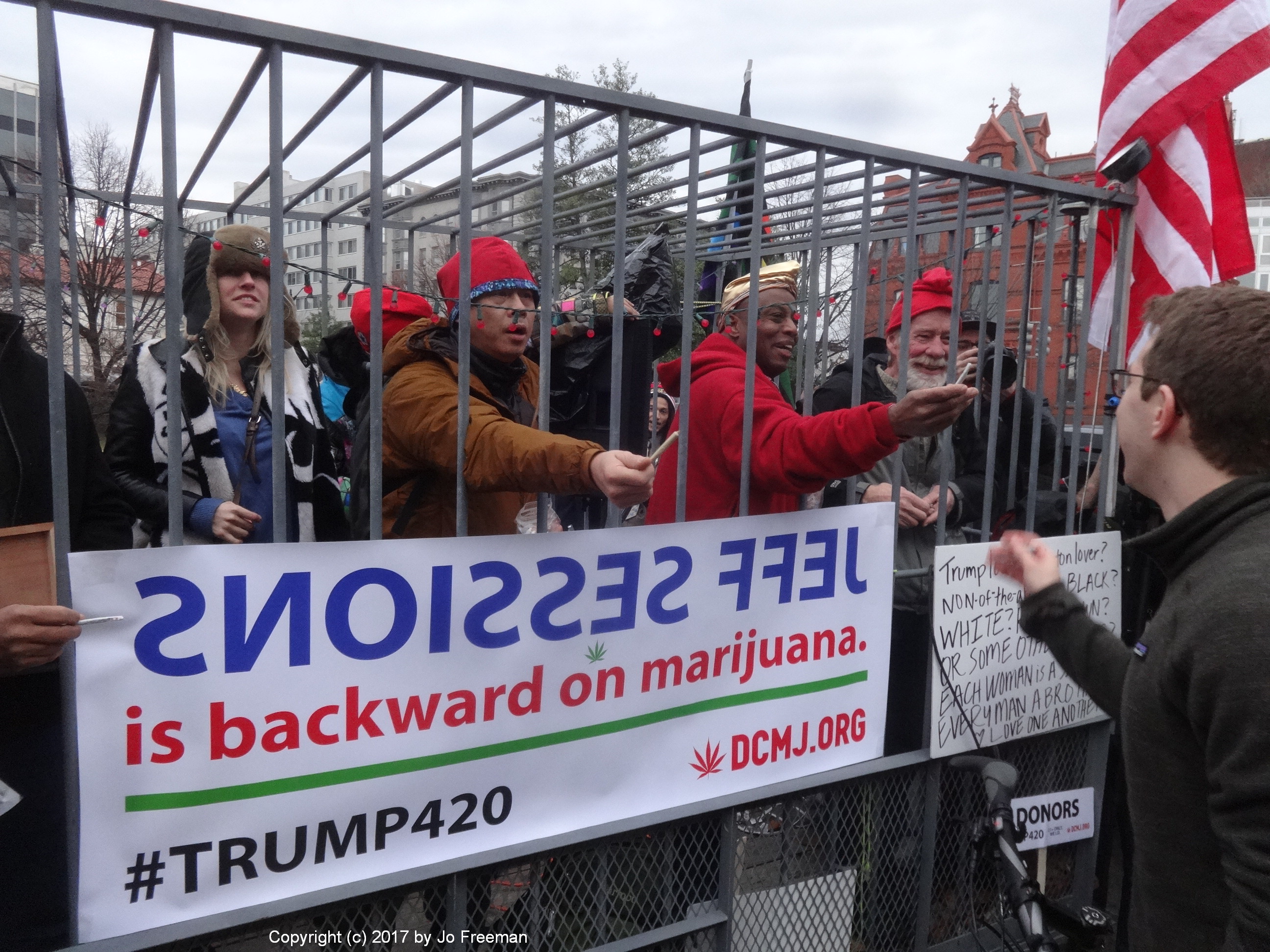The day began with a smoke-in in front of a bank at Massachusetts Ave.and 20th St. where DCMJ was handing out joints made from legally grown cannabis. This is legal in DC under certain conditions. DCMJ wants to make legalization national. I saw about 200 people gathered at that location, where a couple dozen stood in line to show their ID and get a joint. Three people in a cage made to look like a jail were handing them out, with a sign aimed at Attorney General-to-be Jeff Sessions, who wants to keep it a crime. They planned to march to the Mall at 10:00 but I didn’t hang around to watch them do it. The Mall is federal territory where they were subject to arrest, but I didn’t hear what happened.
