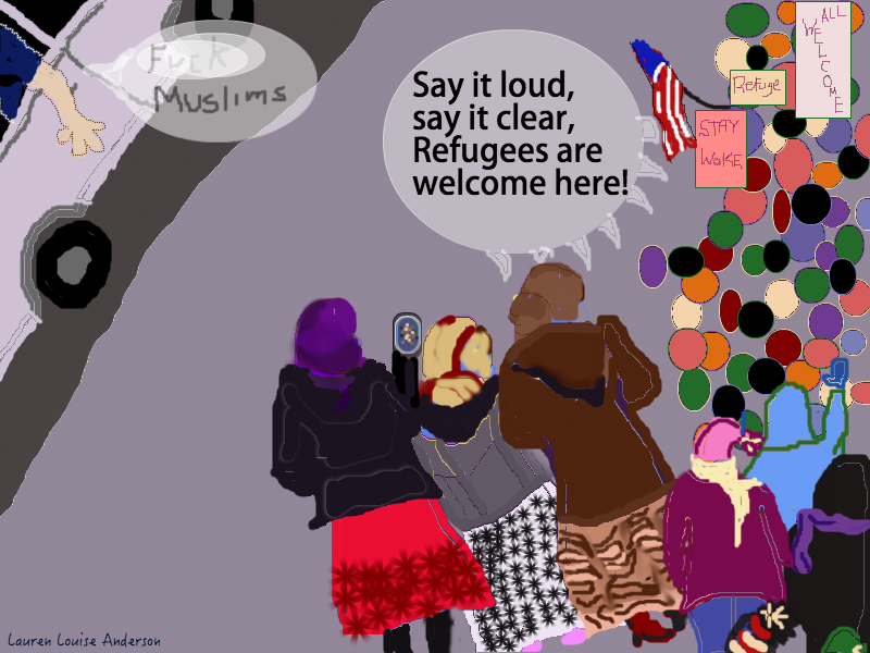 I stood right behind the family, and was moved to tears when three women recorded the booming chant “Say it Loud Say it Clear Refugees are Welcome Here” on their cell phones. The tears came from thinking about that video being shared in their communities and eventual viewers not feeling so attacked for a moment at least. I realized that I was also crying because the only time I see Somali families and Orthodox Jewish families from Postville is when we are all shopping for groceries in Walmart. I was so happy they’d joined liberal, wealthy, white Decorah and hoped they’d feel welcome to come again.