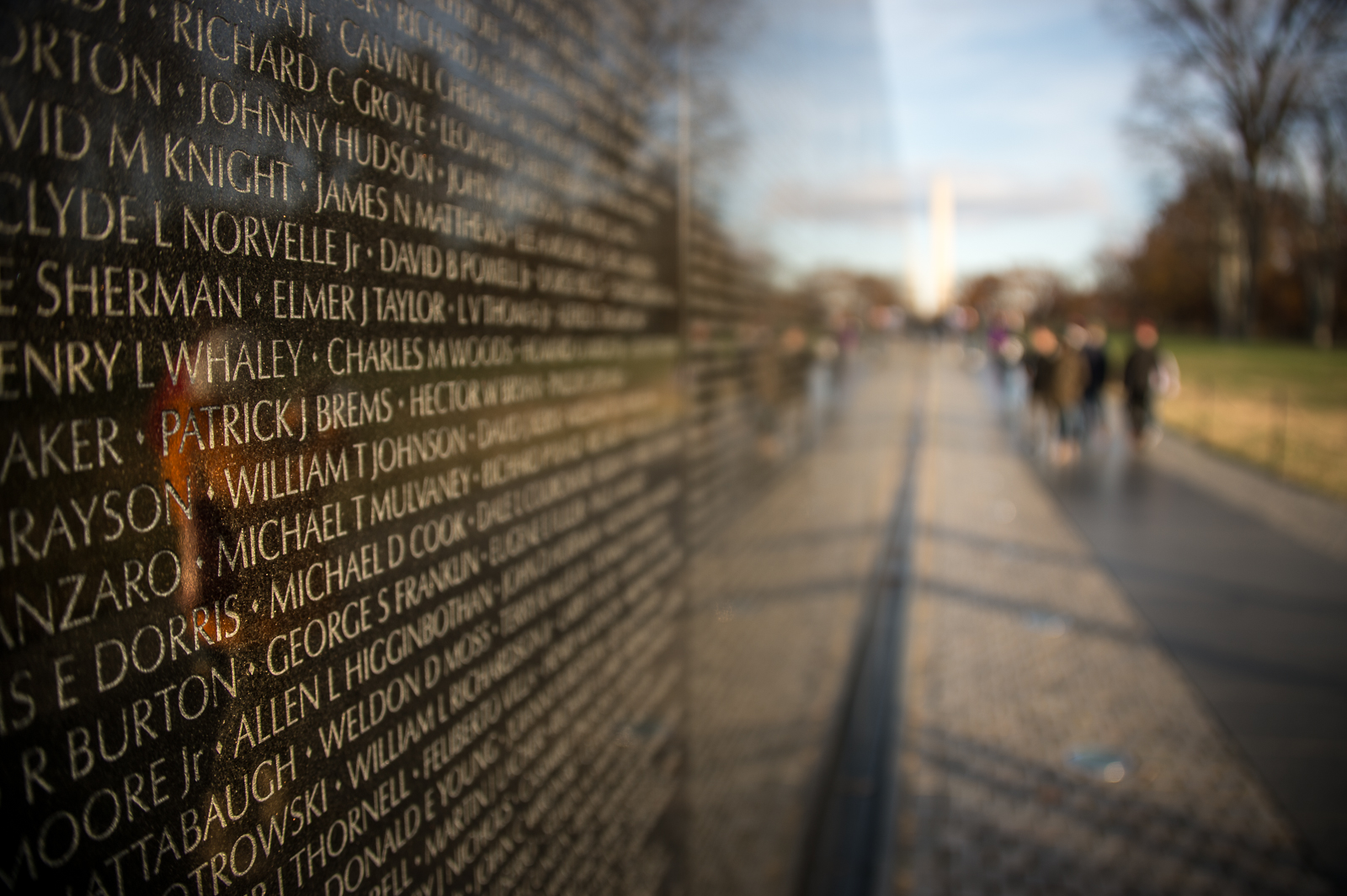 An element of the design competition was that the monument had to include all the names of the fallen. In Lin’s conception, “The need for the names to be on the memorial would become the memorial; there was no need to embellish the design further. The people and their names would allow everyone to respond and remember…The design is not just a list of the dead,” she continues. “To find one name, chances are you will see the others close by, and you will see yourself reflected through them. I knew the timeline was key to the experience of the memorial: a returning veteran would be able to find his or her time of service when finding a friend’s name.”
