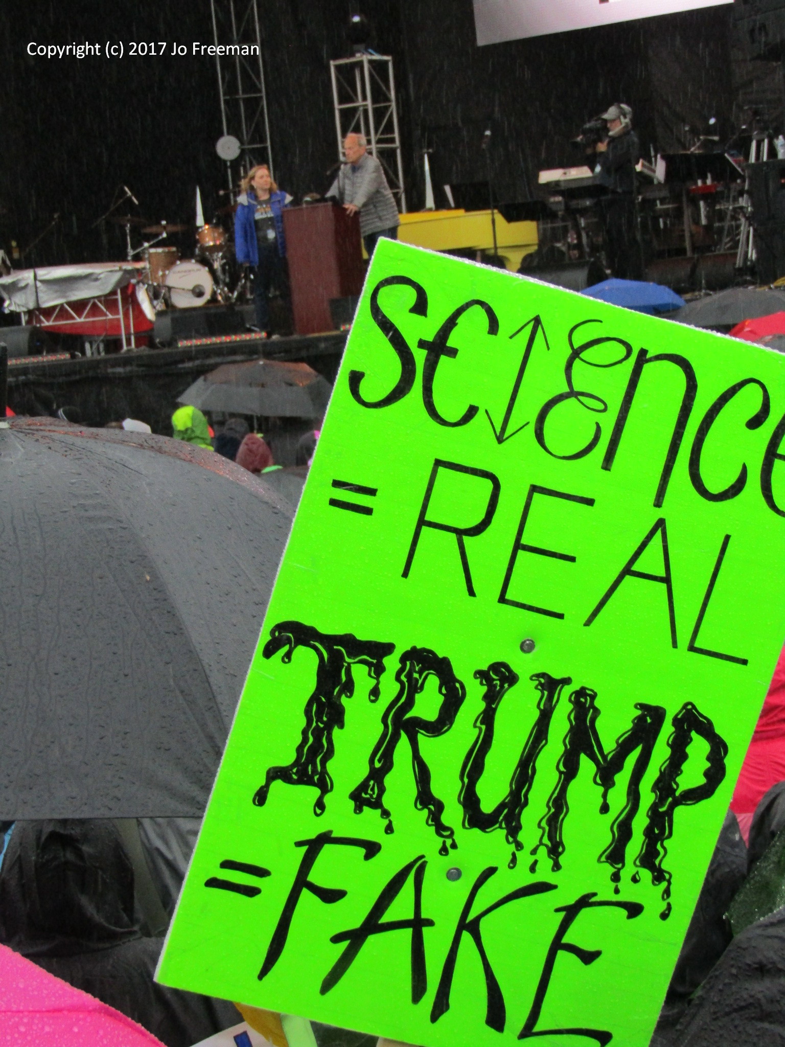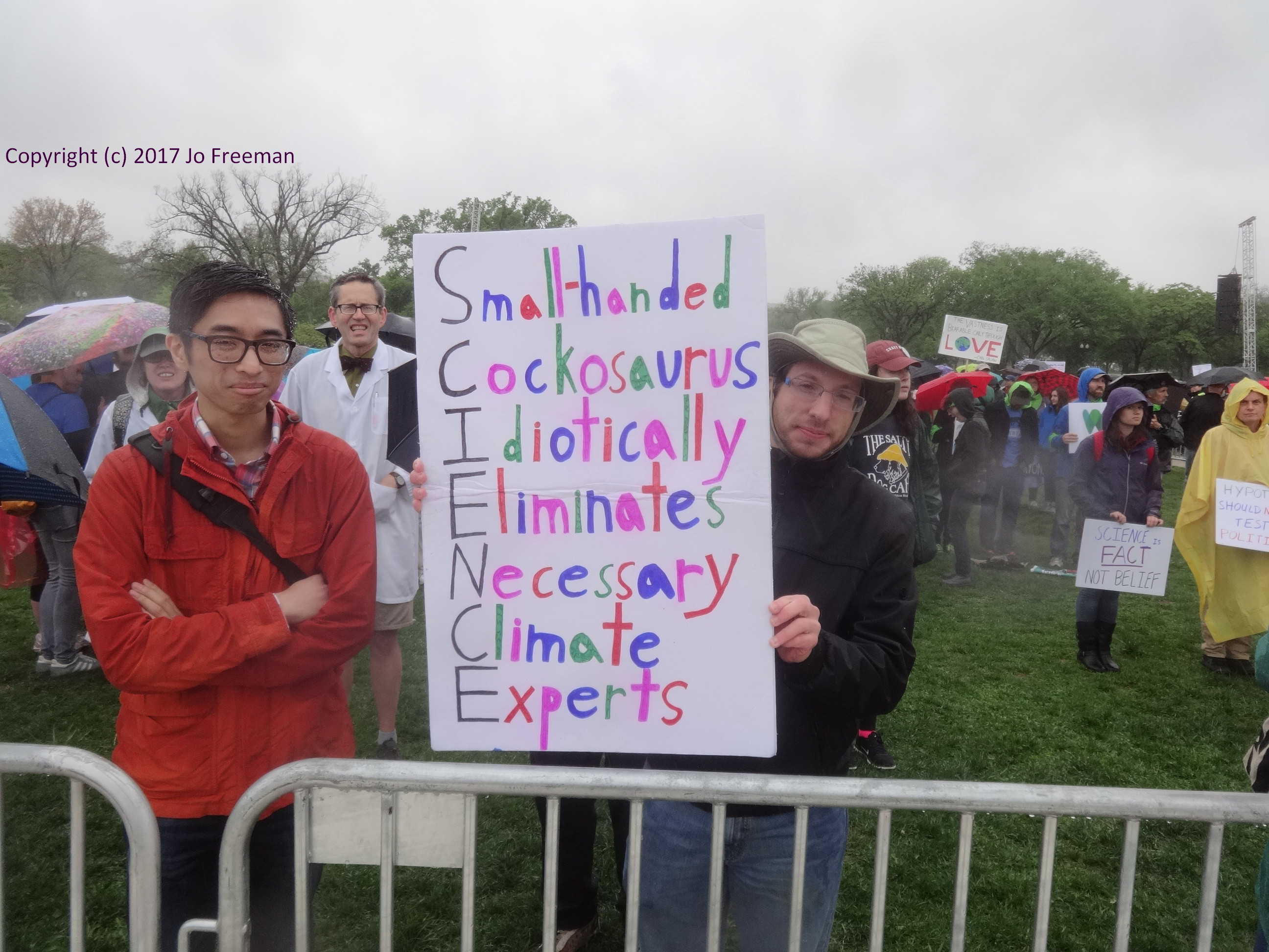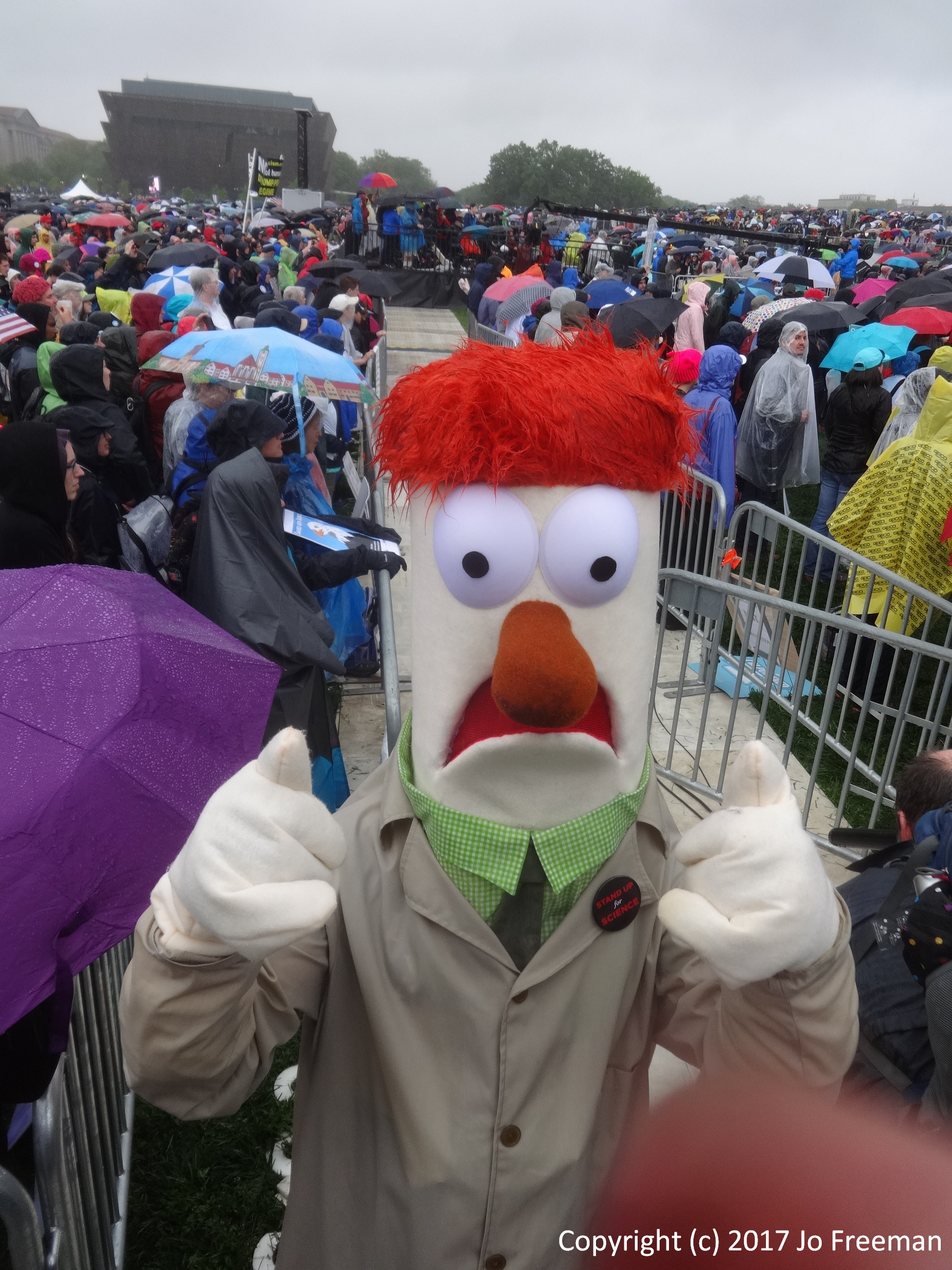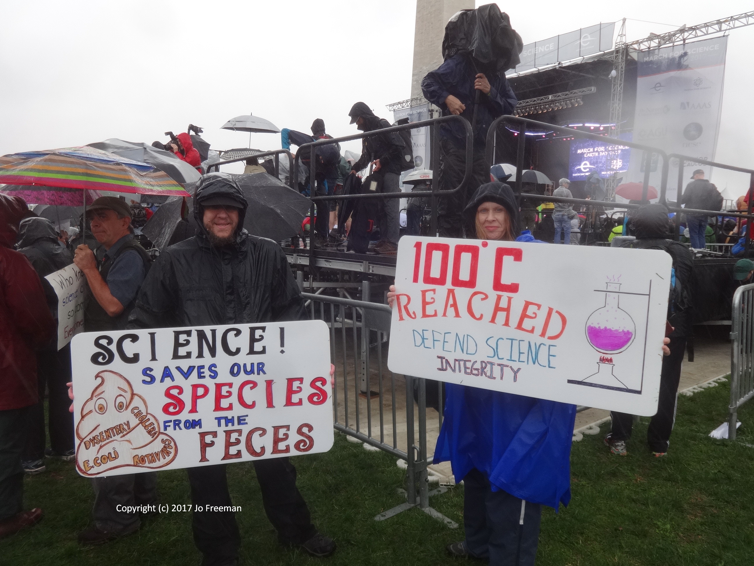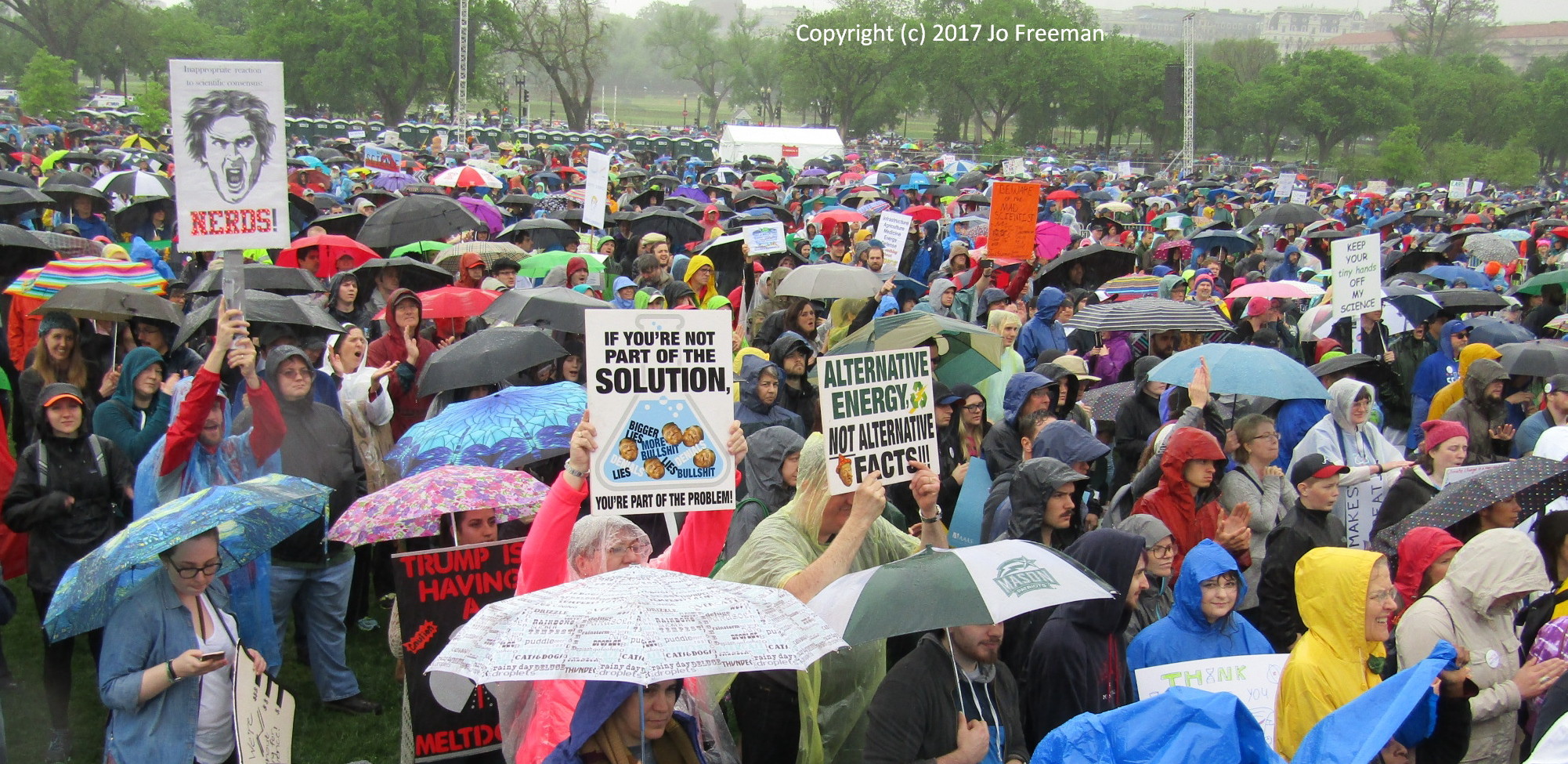 One of several hundred marches around the world, the March for Science in DC attracted about 20,000 participants despite a steady rain. People packed the Mall around the Washington Monument in the morning to listen to speakers and entertainers before marching off to the Capitol in the afternoon. Before the rally, teach-ins were held in tents erected SW of the Monument. That was the only shelter when the rain started. Many retreated to nearby restaurants to refuel and dry out before returning to the rally. People brought their own signs, most of which were not rain-proof. Instead of a sea of signs in front of the stage, one saw a sea of umbrellas, with a few signs sticking up like the occasional flower in a desert. In order to emphasize that science was nonpartisan, elected officials were not invited to speak. However, many of the home-made signs had an anti-Trump theme. The Monument square was declared a security zone; everyone had to go through a bag check to get in.