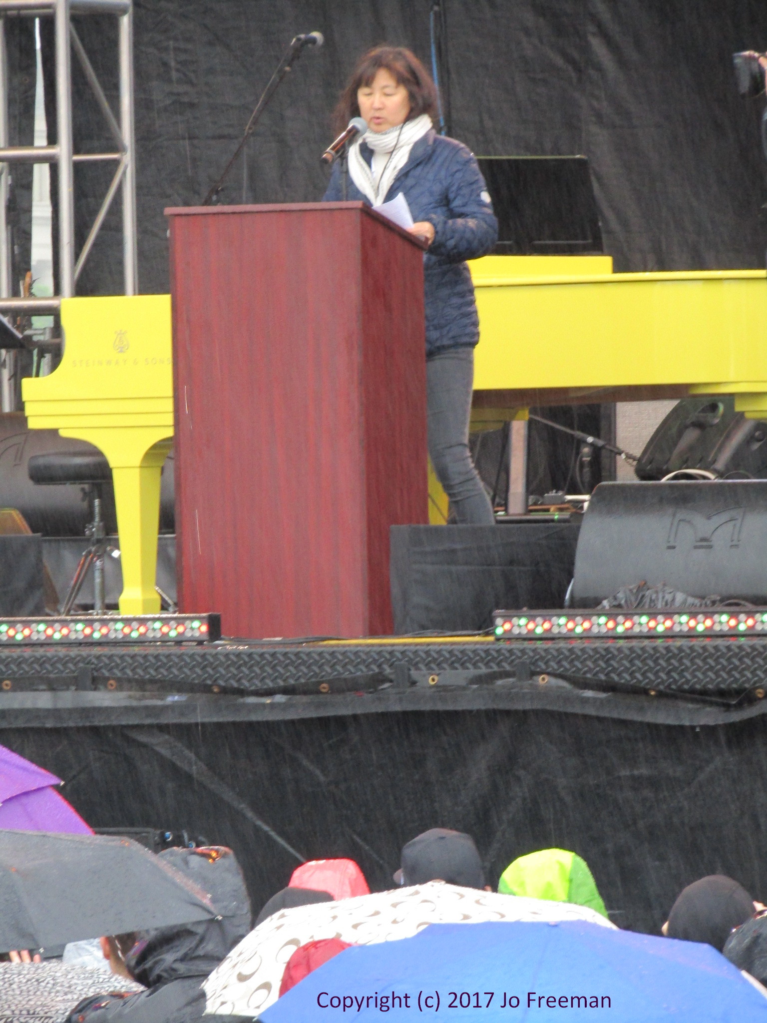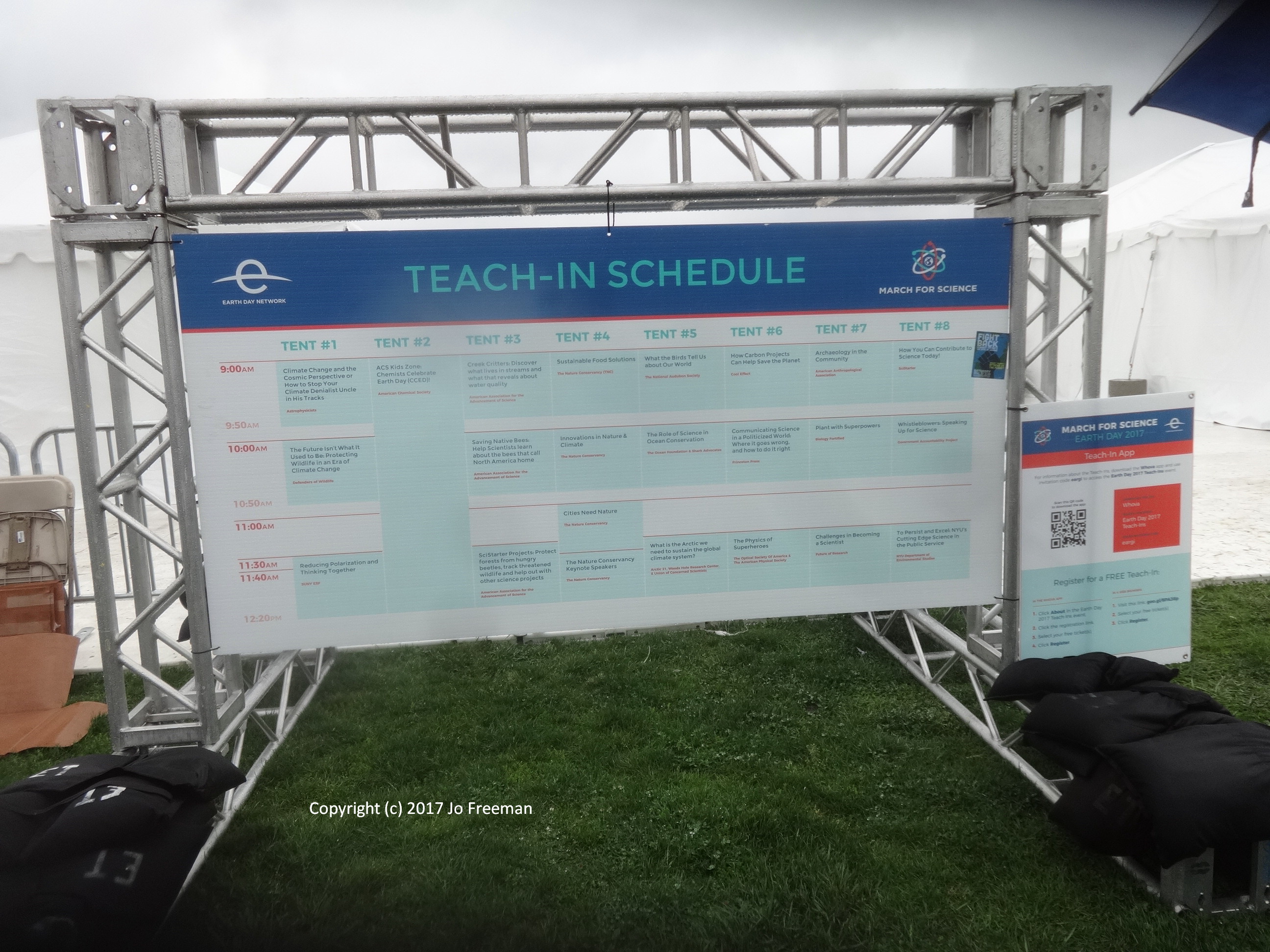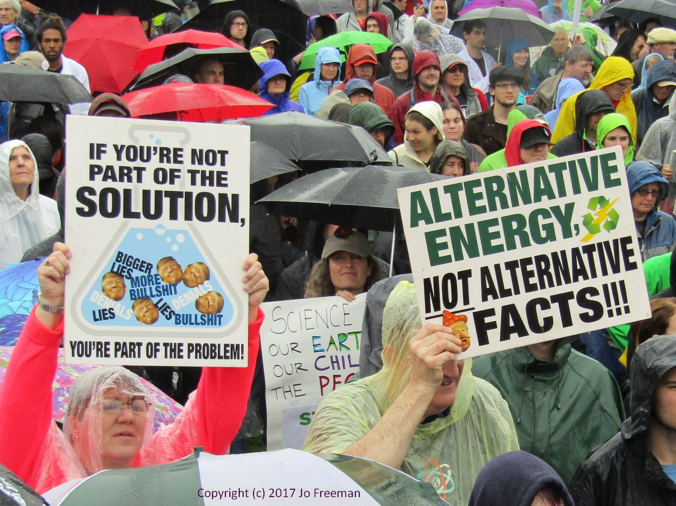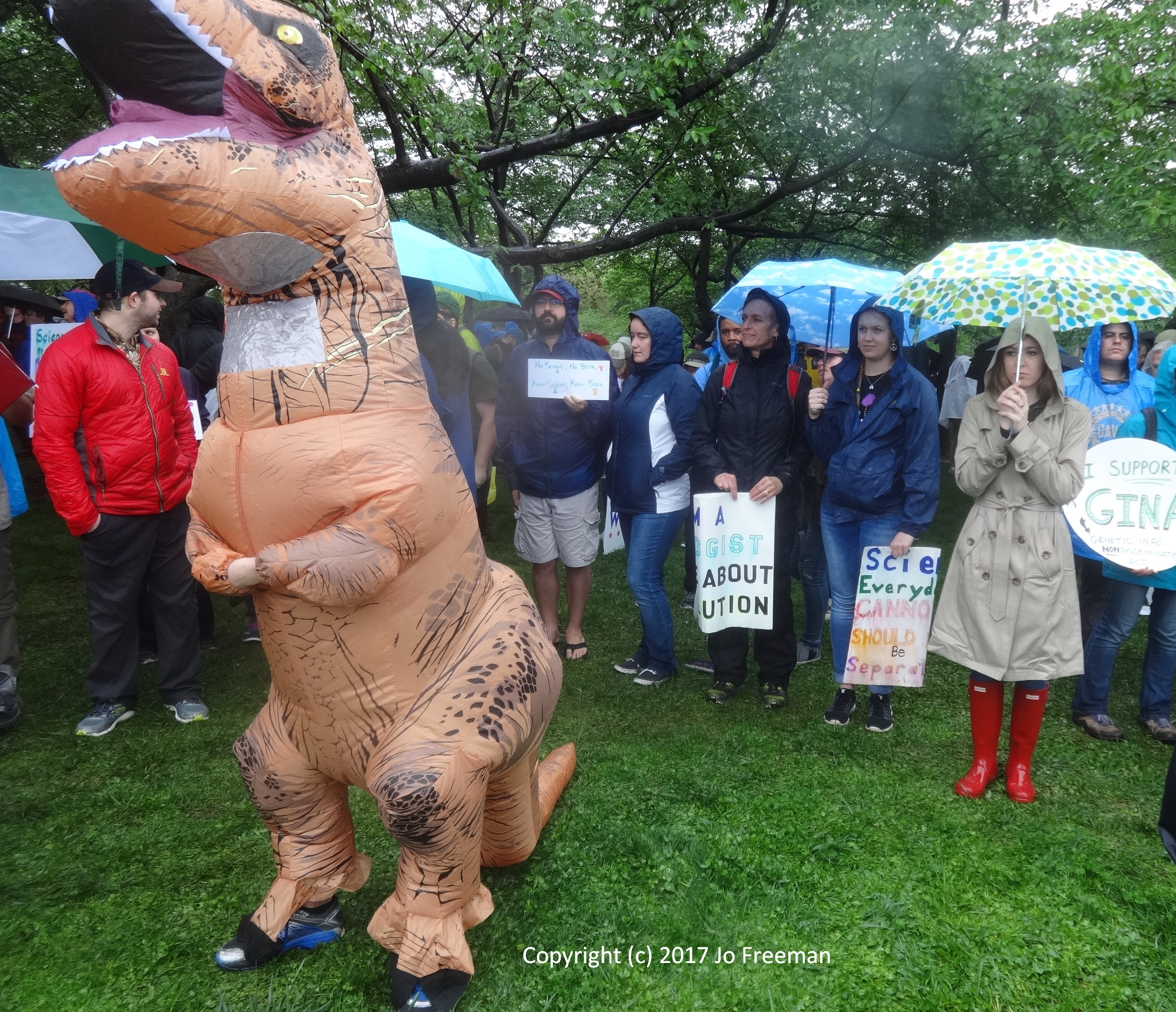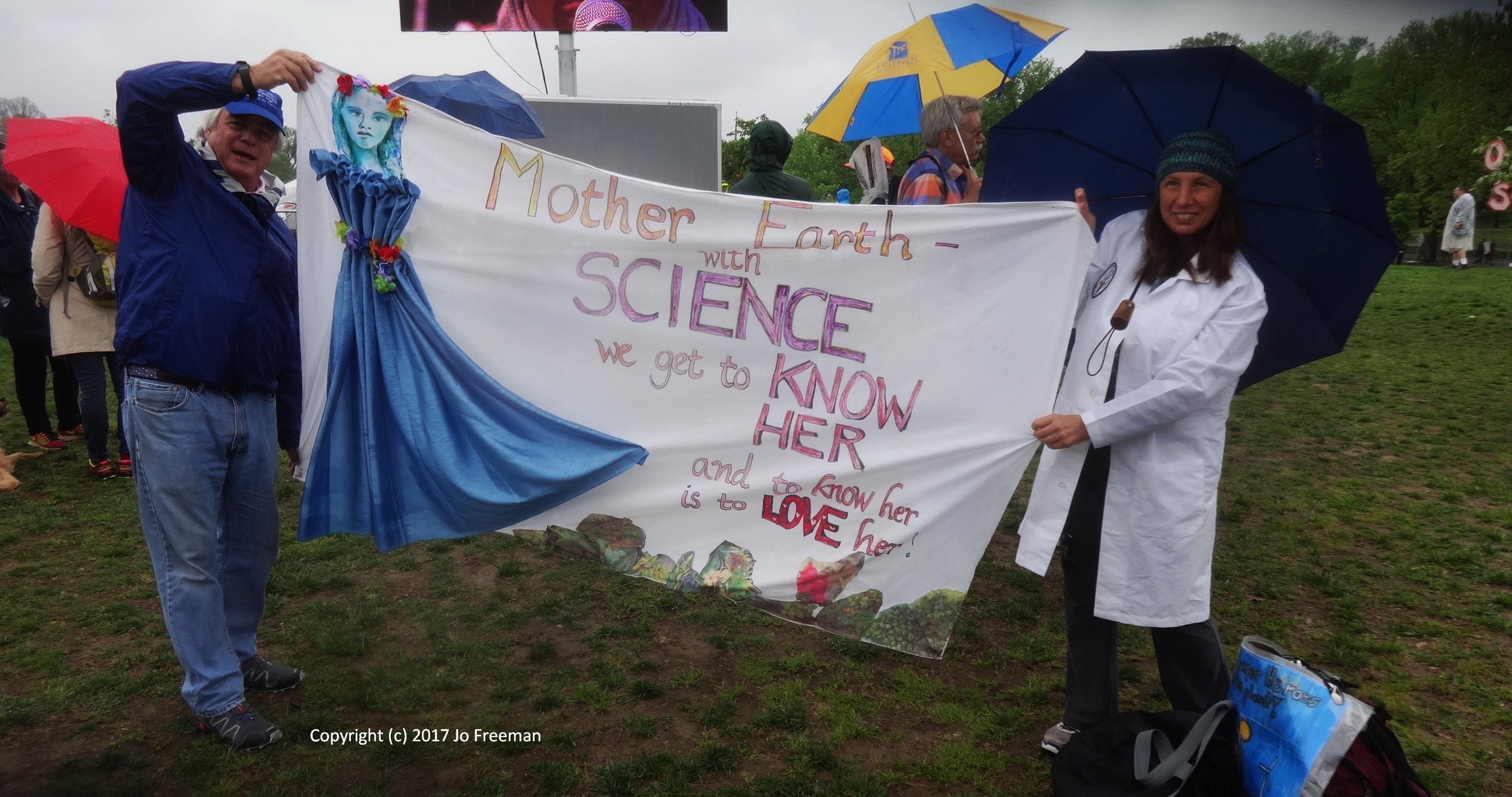 One of several hundred marches around the world, the March for Science in DC attracted about 20,000 participants despite a steady rain. People packed the Mall around the Washington Monument in the morning to listen to speakers and entertainers before marching off to the Capitol in the afternoon. Before the rally, teach-ins were held in tents erected SW of the Monument. That was the only shelter when the rain started. Many retreated to nearby restaurants to refuel and dry out before returning to the rally. People brought their own signs, most of which were not rain-proof. Instead of a sea of signs in front of the stage, one saw a sea of umbrellas, with a few signs sticking up like the occasional flower in a desert. In order to emphasize that science was nonpartisan, elected officials were not invited to speak. However, many of the home-made signs had an anti-Trump theme. The Monument square was declared a security zone; everyone had to go through a bag check to get in.