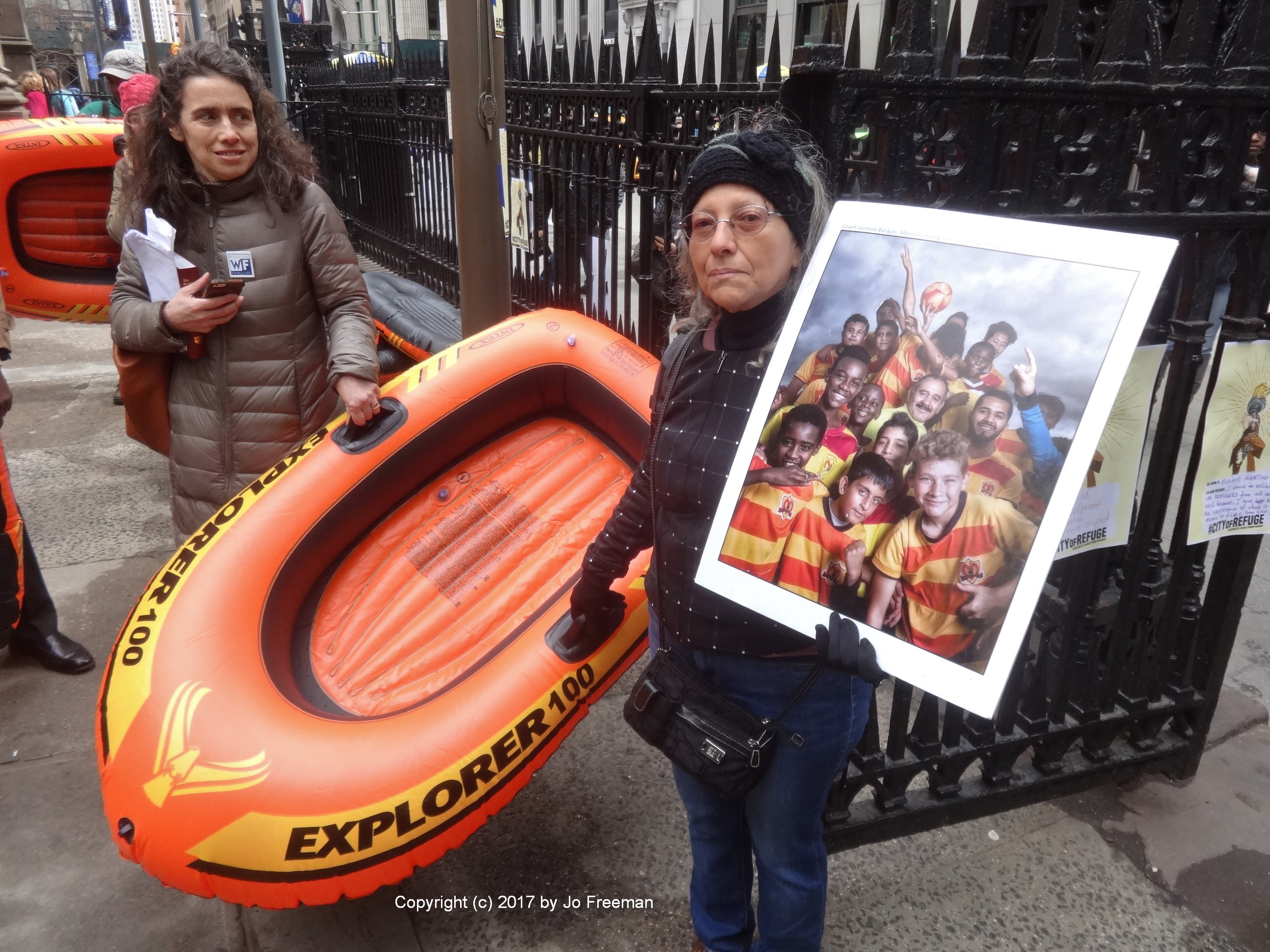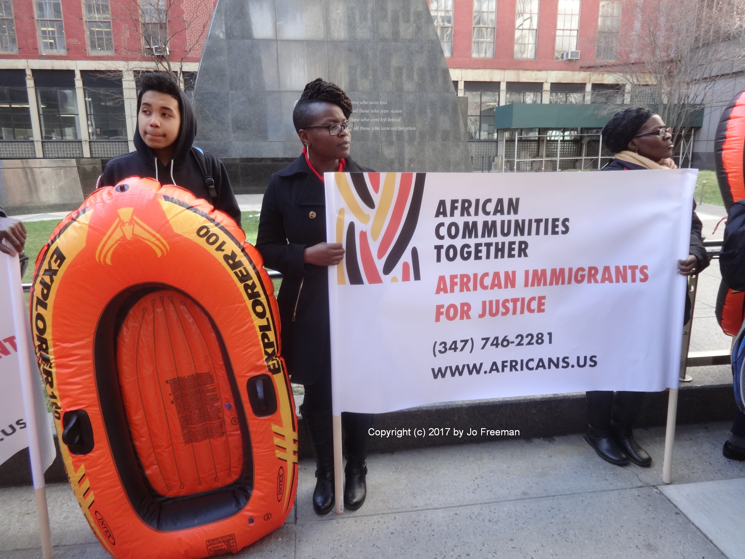 A few dozen people braved the rain to engage in a two day action for refugees on March 28 and 29. Organized by African Communities Together, they marched out of Trinity Church in lower Manhattan carrying inflated rafts to symbolize the means by which refugees often leave Africa. Their target was Trump’s efforts to stop refugees from entering the country and his policy to limit asylum applications.