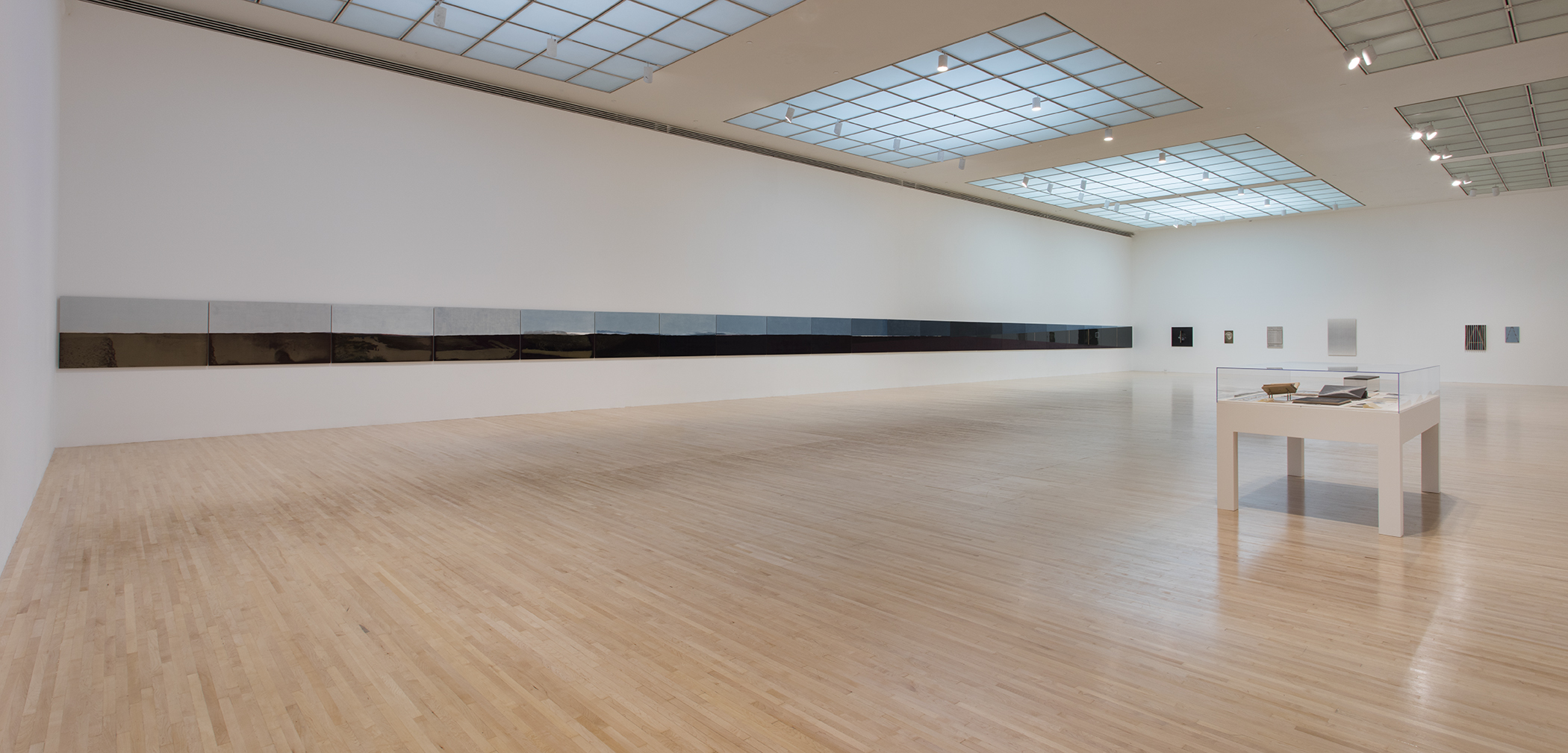 Quaytman makes explicit reference to these paintings in her 22-panel landscape painting that spans an entire wall at MoCA. Unlike Shadows, which hung in total surround and created a disjointed, broken progression, Quaytman’s multi-panel panorama paints what at first glance appears as a clear, linear visual narrative: the survey of land from a single perspective, the eyes moving left to right and back again. But this is a narrative whose physical dimensions are formed by the institutions and histories that compose its content. What appears as a straight line, one that mimics the general direction of foundational histories in art, is in fact a closed circle made to lie flat by the walls of the institution and bent to appear as a spectrum. The sky in Quatyman’s painting is of the dawn as the show’s title suggests and this morning light fades into darkness across the panels, then returns. It is a simple metaphor for time, where light from the rising sun represents the past and near total darkness the future. She positions the viewer, and herself as an artist, in the pose of the Angelus Novus, projecting out from the picture plane, able only to view the past.