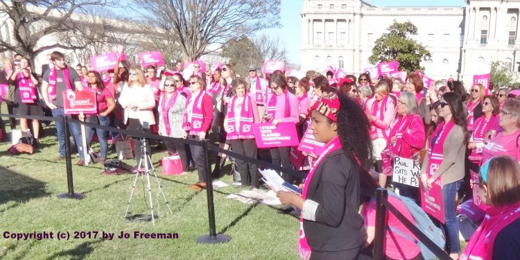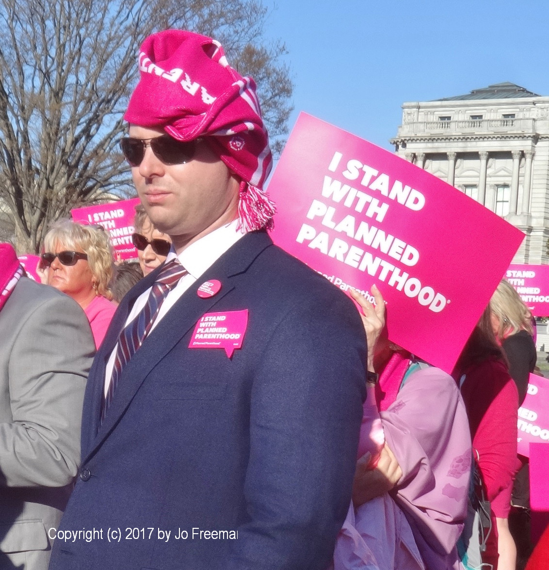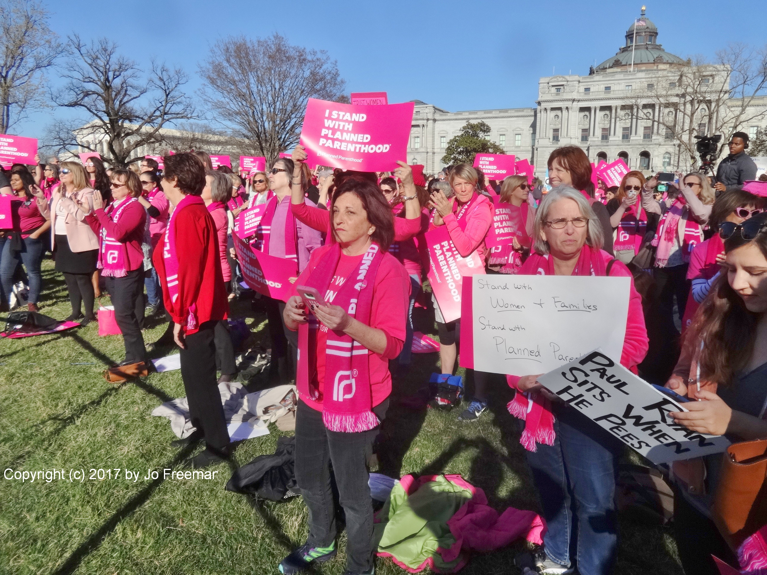 The rally was called a “pink out” and pink was definitely the color of the day. Just in case not enough people wore pink, PP passed out long pink mufflers and small pink signs. Some women wore the pink pussy caps made popular by the Jan. 21 women’s march. This was not the first pink out rally. Several others had already been held at different state capitols and at the district offices of some Members of Congress.