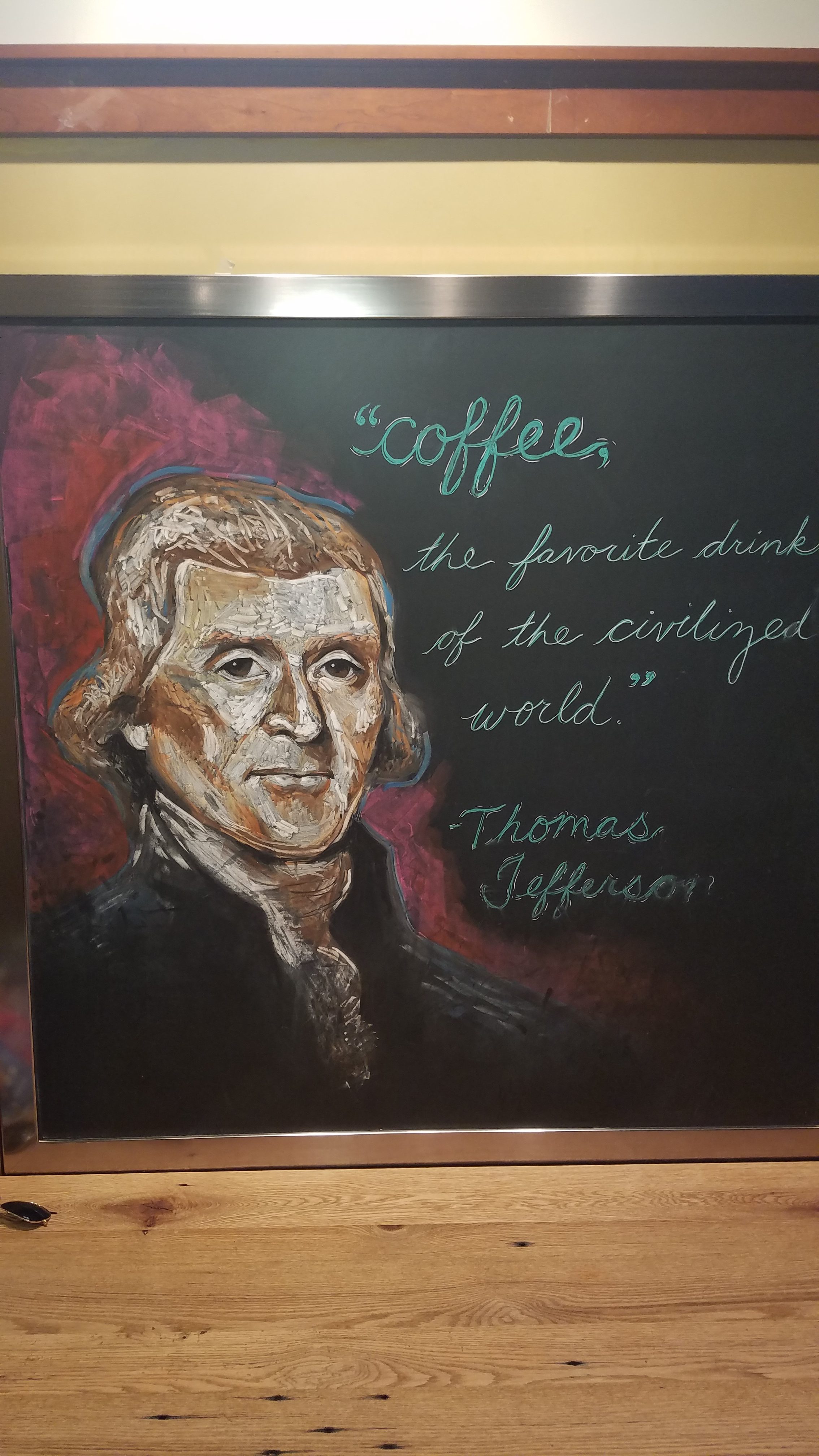 To understand why this debunking felt, to a number of our students, absolutely necessary, one must understand the way that the University of Virginia is, in its daily displays and everyday metaphors, identified with Jefferson the man rather than Jefferson the author. Ernst Kantorowicz, in The King’s Two Bodies: A Study in Medieval Political Theology, discussed the representation of Kings that appeared on various objects, including those used in everyday life, like coins. In the public, everyday life of the University of Virginia, something similar happens. It is not our careful scholarship on Jefferson that choreographs campus. Rather, on “Grounds” (the name itself is a kind of sacralization), we experience and reproduce the banal sacralization of Jefferson’s second body. We find, in myriad little signifiers, a public interpretation of Jefferson as a wise and pure saint. This interpretation seems to inhabit our classrooms, our coffee shops on campus (the photo that accompanies this story was taken by me), and every nook and cranny of our buildings. The references to his having “built” the university (when in fact it was built by enslaved persons); the habitual reaching for his wisdom, insight, sayings, and words on seemingly every occasion of professional significance; the ongoing connection to his literal home at Monticello, presented repeatedly as glorious; all of these serve to instantiate a certain fantasy that has little to do with the subtlety and contradictions of Thomas Jefferson’s life and thought, or the difficult and contentious history of the American republic. Rather, the day-to-day fantasy presented at the University is something like this: ‘Jefferson’s sacred genius legitimated his power, and that genius was the genius of the father of a household, who built the future so his young charges could live and work freely on their studies.’ But if the University is, metaphorically, Jefferson’s household, then one cannot deny or hide a clear implication of this metaphor: that the sovereignty of the house accrues to the father, and that in Jefferson’s life, that was a violent sovereignty of white over black.