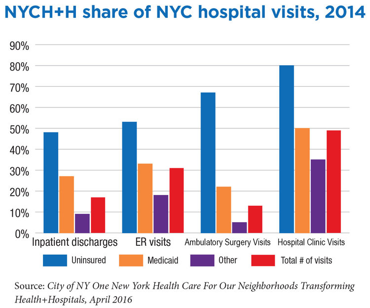 Private hospital networks prosper, to some extent, at the expense of the public hospitals. Private sector providers can avoid heavy costs precisely because NYCH+H is there to assume this load. Despite their nonprofit charitable charters, private hospital systems have been shifting the burden of caring for the uninsured and for people with psychiatric and substance abuse diseases to the public system. Even as the number of uninsured New Yorkers declines, NYCH+H’s share grows.