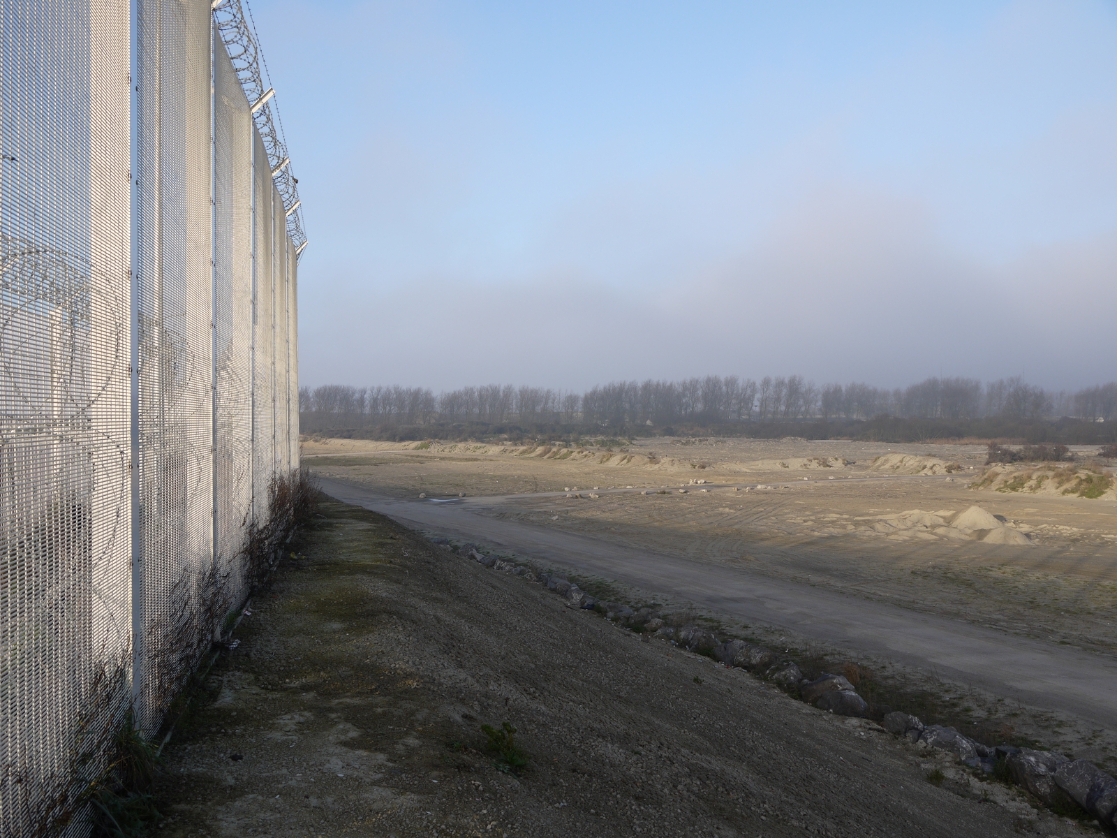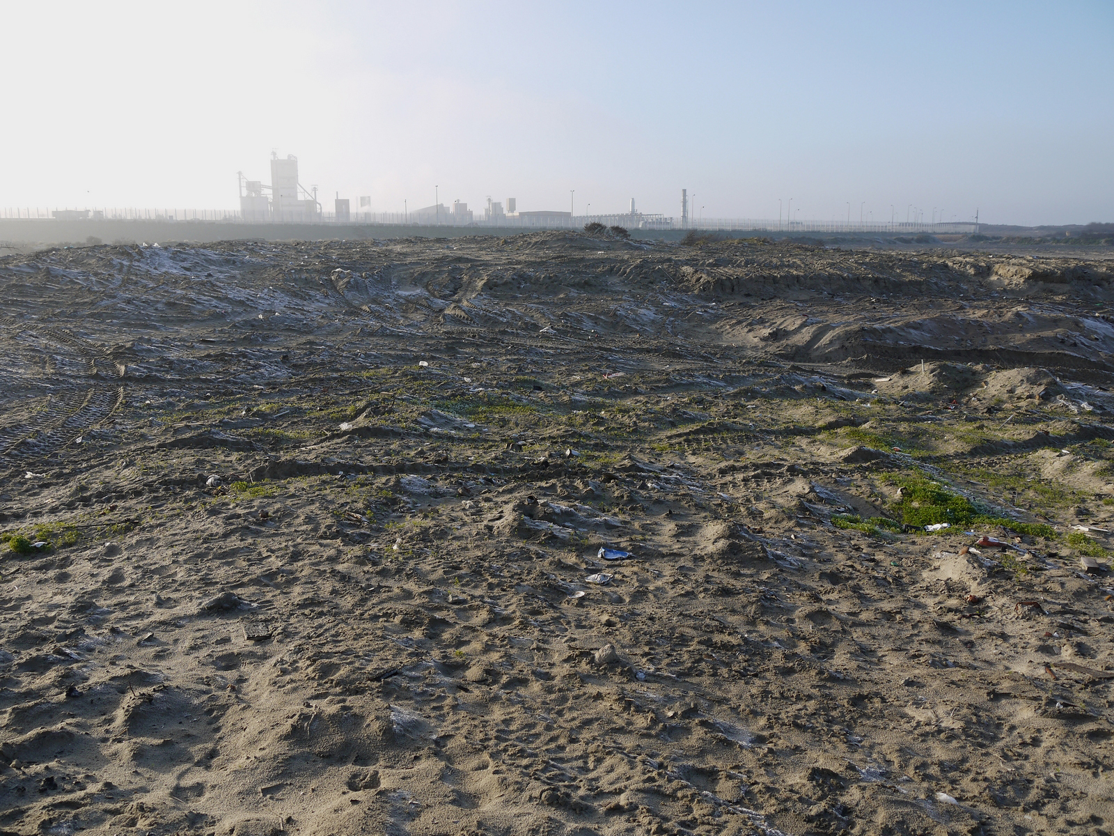 To return to the mound once at the heart of the Jungle is to look out to a horizon still framed by silver razor wire fence behind which articulated trucks glide silently. We would climb up onto this mound from the mini-Somalia, the Belgian kitchen with the Container camp behind us. But this now an empty space of freshly turned soil, a Martian landscape that no past writing prepares us for.