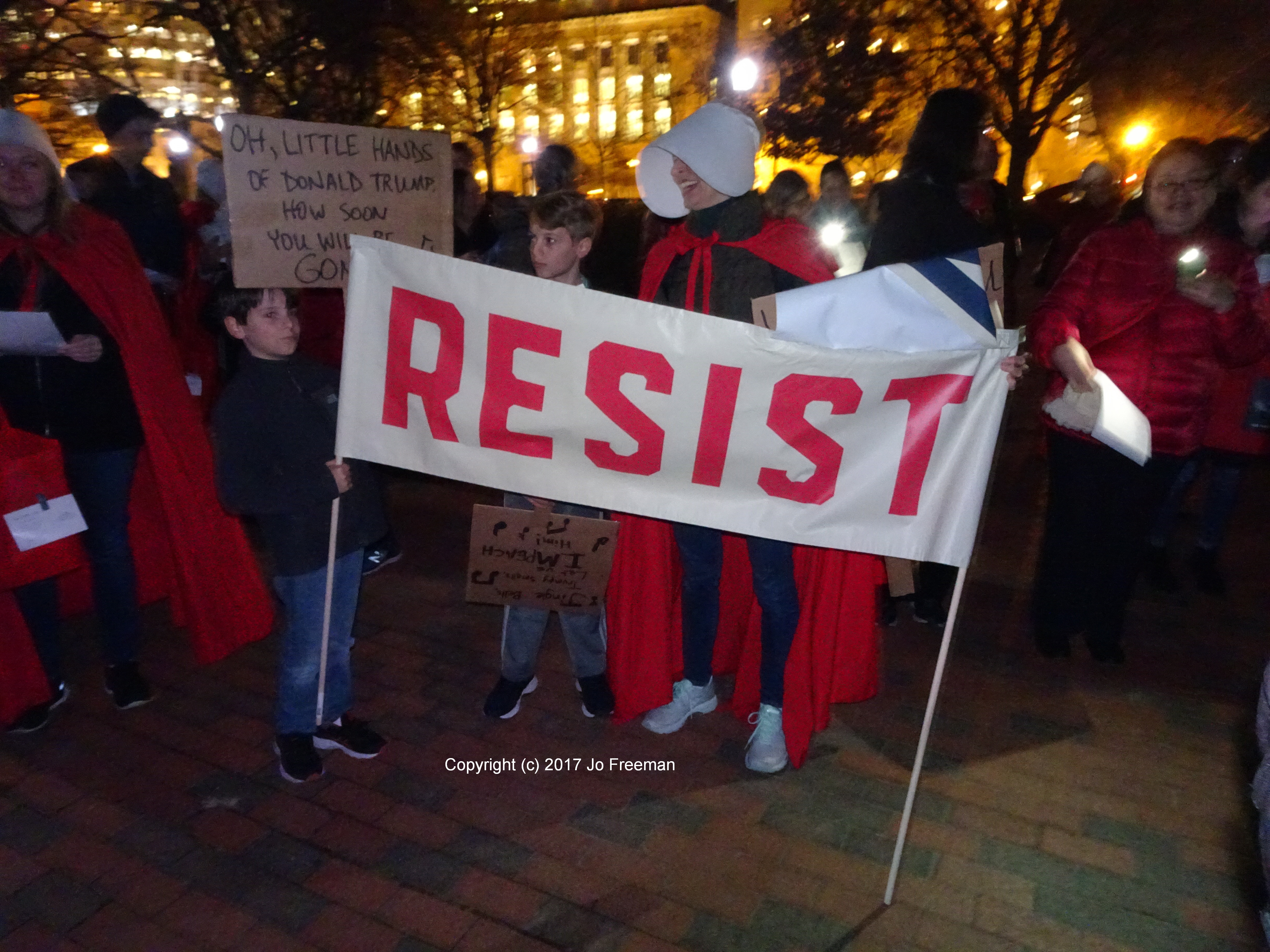 A dozen were dressed in the red cloaks of the handmaidens from The Handmaid’s Tale. Their signs evoked recent events, such as the seven forbidden words.