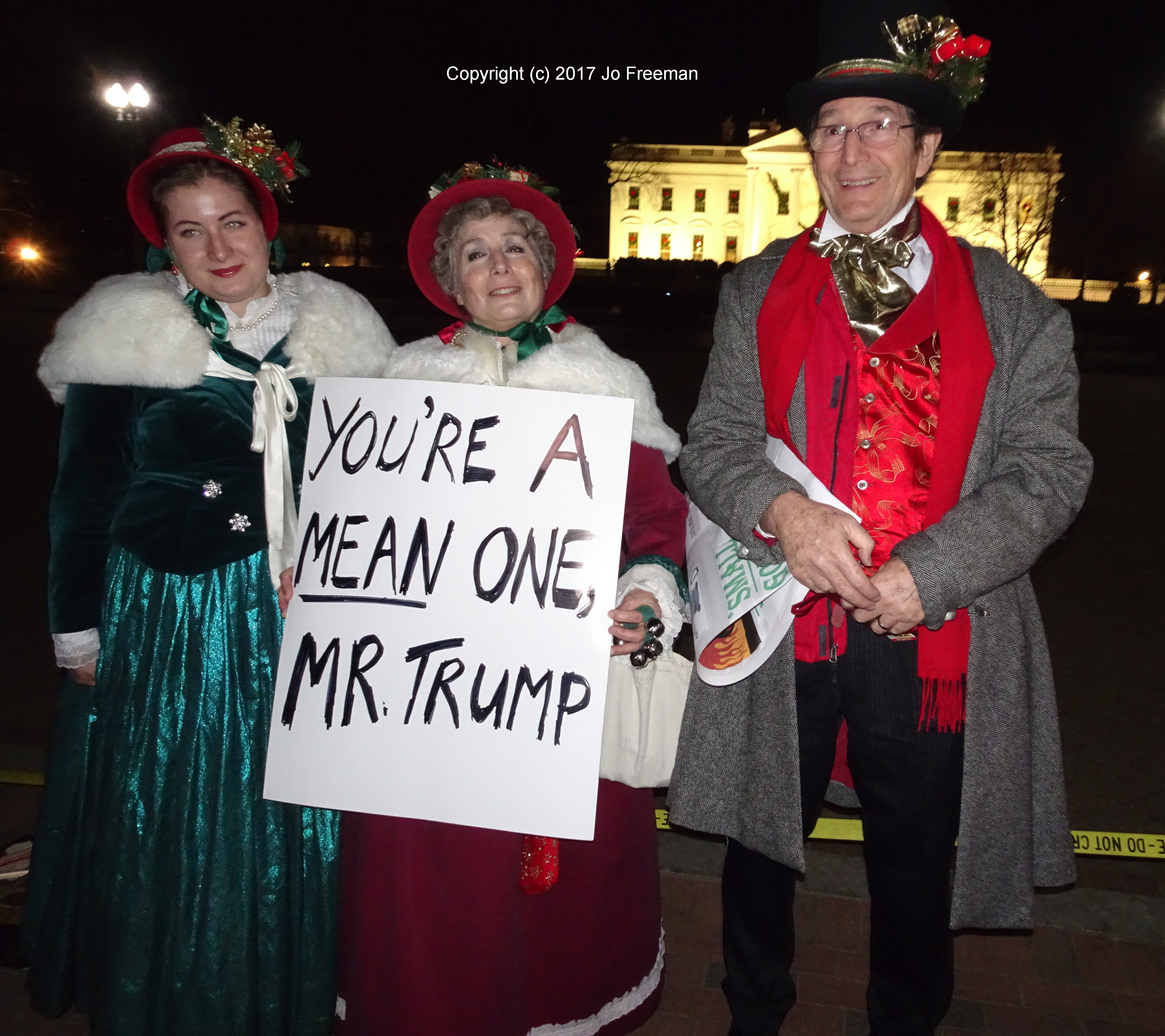 Some three dozen people gathered across the street from the White House a few days before Christmas to sing carols to President Donald Trump.