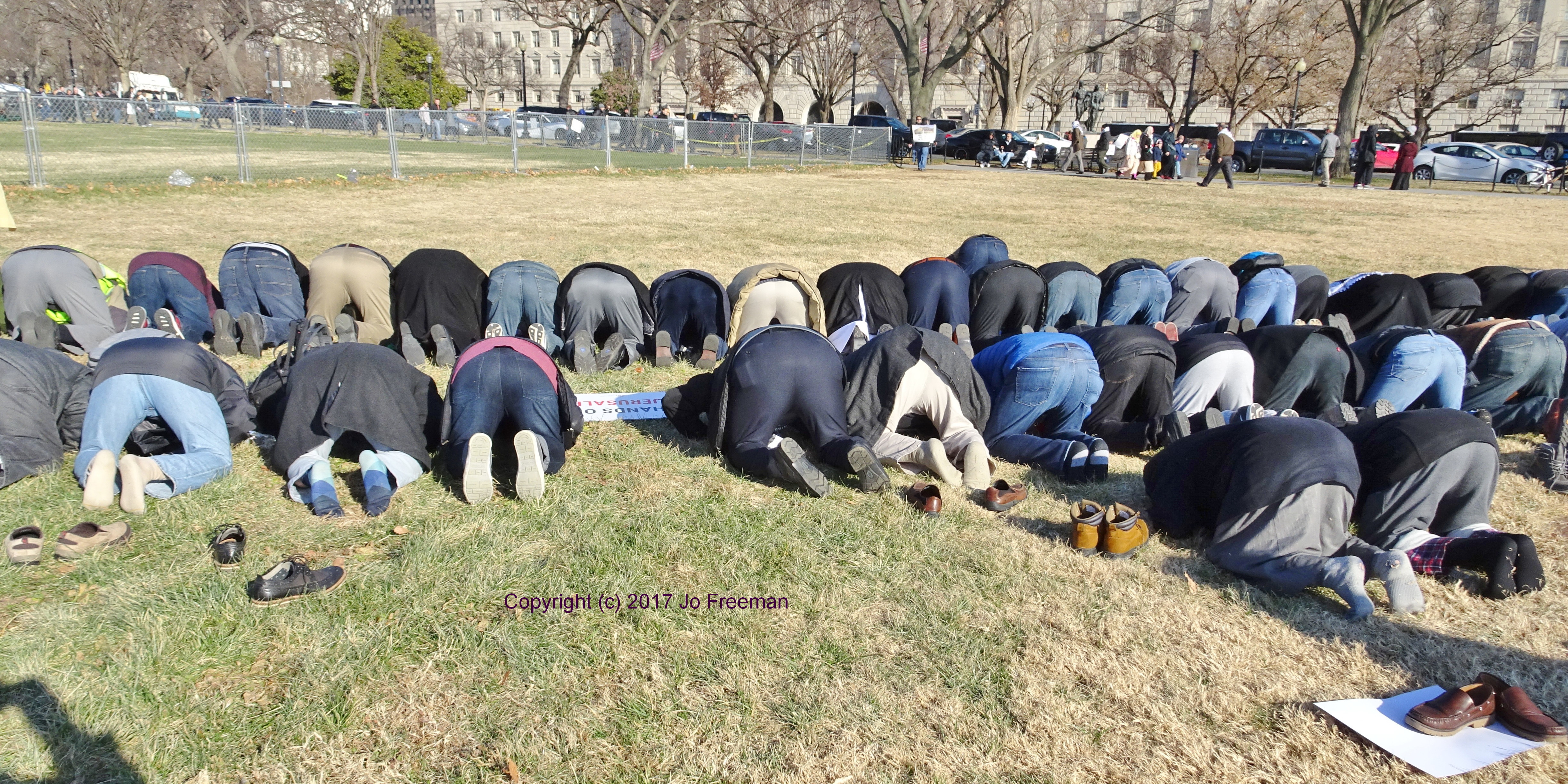 About 50 men were in the front lines. A dozen women prayed in back of the men.