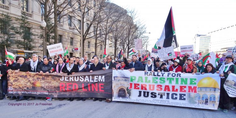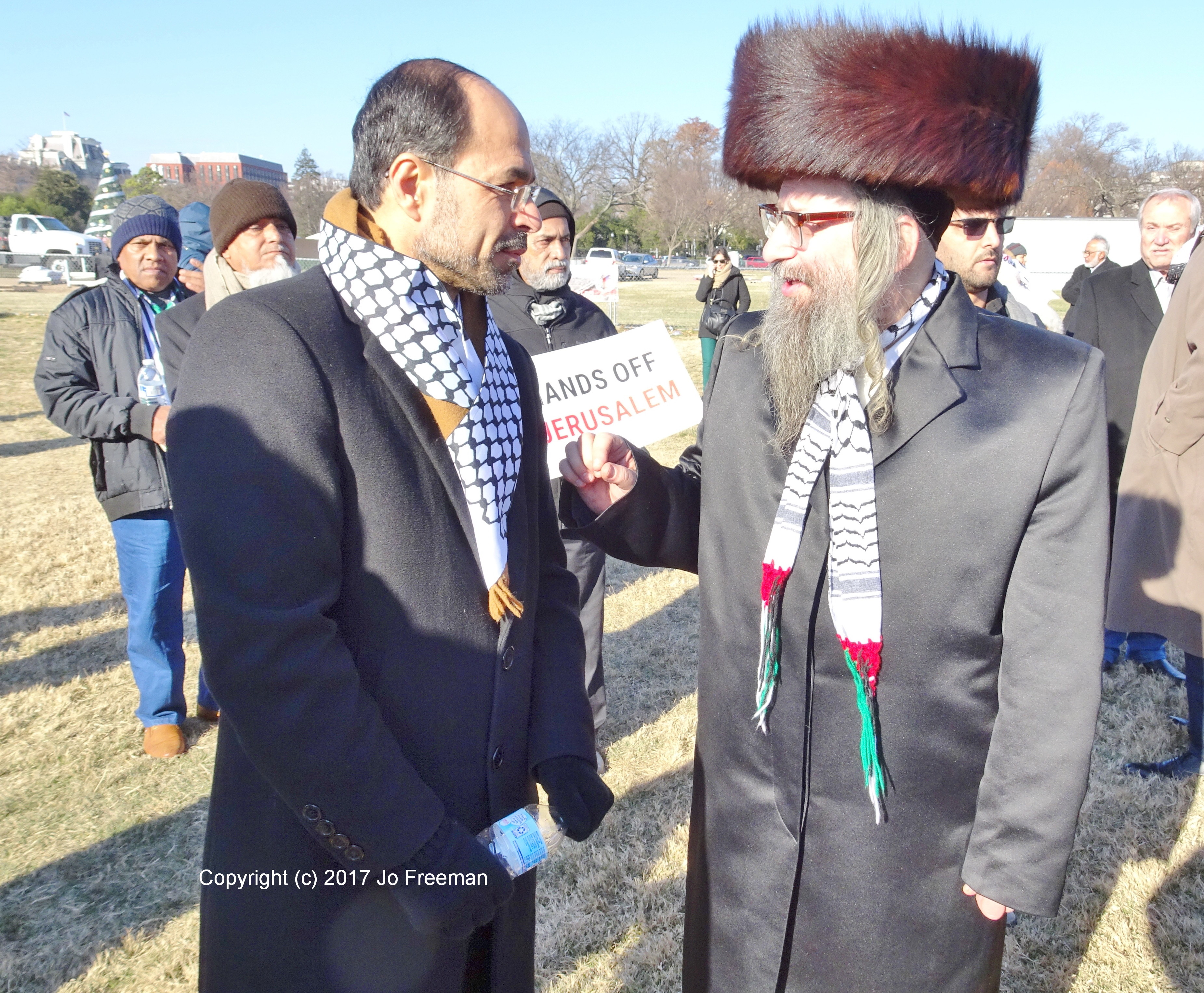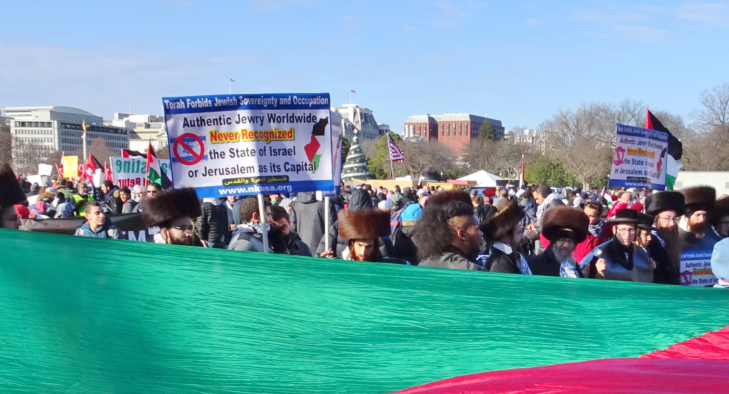 The rally was joined by two dozen men and boys from NKUSA.org. Based in upstate New York, with three synagogues in Brooklyn, they regularly come to DC to participate in demonstrations against Israel, and proudly fly the Palestinian flag. Women stay at home.