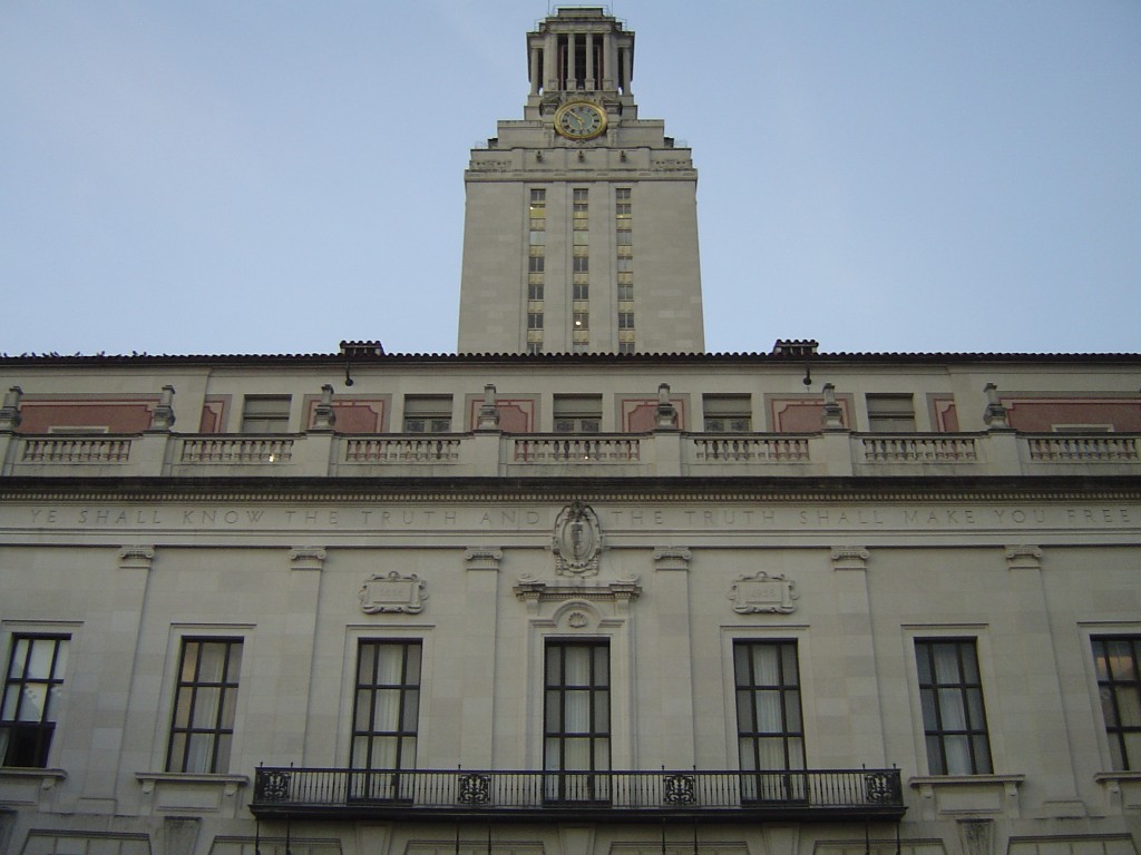 The most striking architectural feature of the University of Texas at Austin is the tower that sits atop a hill at the center of campus. It is a twenty-seven story limestone monolith; a “toothpick” according to one detractor, more suited to the New Jersey cityscapes that inspired its architect, than to the landscaped grounds and rows of squat Italianate villas that radiate out from it. The tower is, in many respects, the focal point of university life. The clocks that crown the four faces of the building govern time on campus, their bells punctuating daily routine. The silhouette of the tower supplies the monumental backdrop for university ceremonies such as graduations, as well as a canvas upon which the play of orange lights serves to announce sporting (and, occasionally, academic) victories. The tower’s wraparound observation deck affords visitors a cartographer’s perspective of the campus; it is the sort of view, one of an active mess of humanity and its fabricated environment in miniature, that inspires grandiose ideas. Indeed, it was on this observation deck that a young Marine once speculated to his friend that “a person could stand off an army from atop of it [the tower] before they got him.” (Lavergne 23)